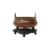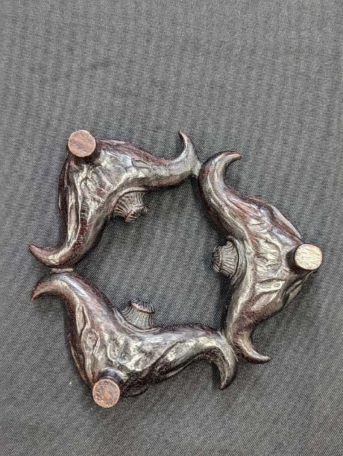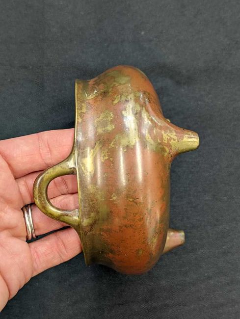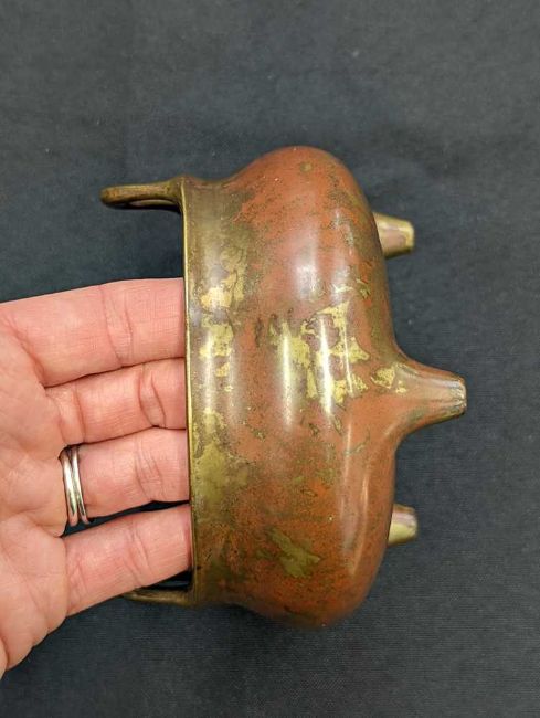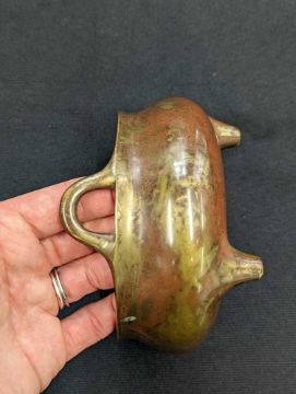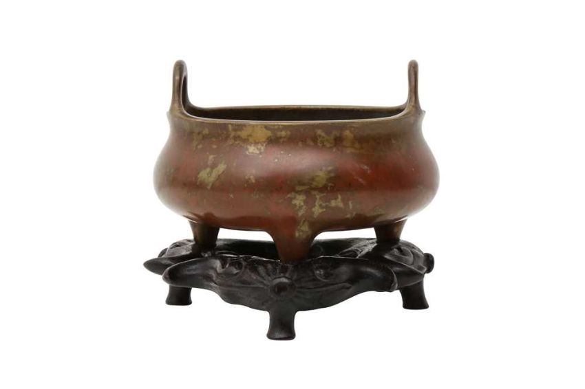 With a compressed circular body supported on three conical feet and a pair of loop handles rising upwards from the gently everted rim, the reddish surface marked with irregular gilt splashes, the base with a sixteen-character Xuande mark, together with a wood stand carved as three conjoined water chestnuts,