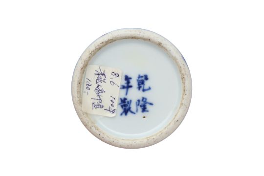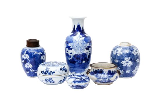 Comprising two circular boxes and covers, one painted with insects amidst blossoms, the other with a scholar and his attendant in a garden scene, the base with a four-character Qianlong mark, together with a small censer, two 'prunus' jars, and a vase