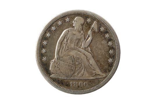 New Orleans mint. Obv: Seated Liberty looking left, holding liberty cap on stick and a shield, 1860 in exergue. Rev: Eagle holding arrows and olive branch in talons, O below. KM. 71. Good.