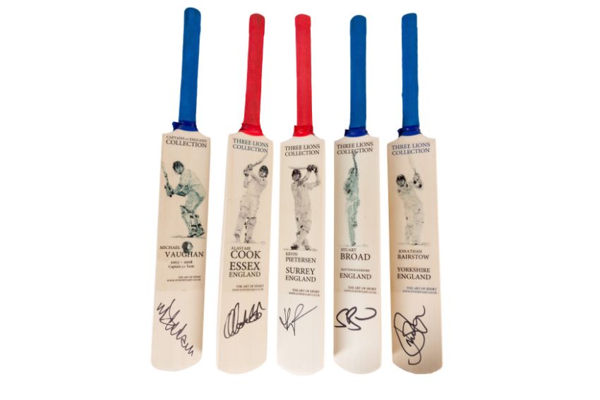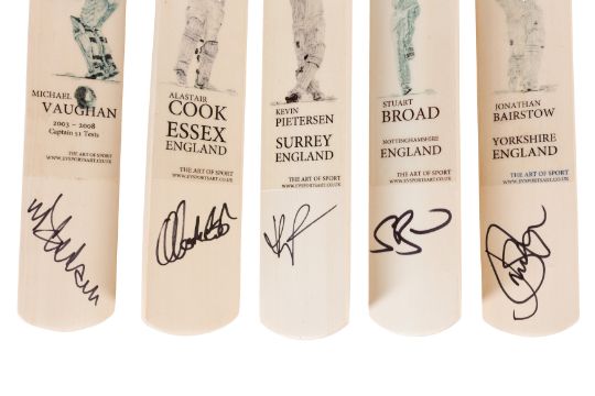 Five miniature cricket bats, individually signed by Jonathan Bairstow, Stuart Broad, Alastair Cook, Kevin Pietersen and Michael Vaughan, all in very good condition, each 46 cm long (5)