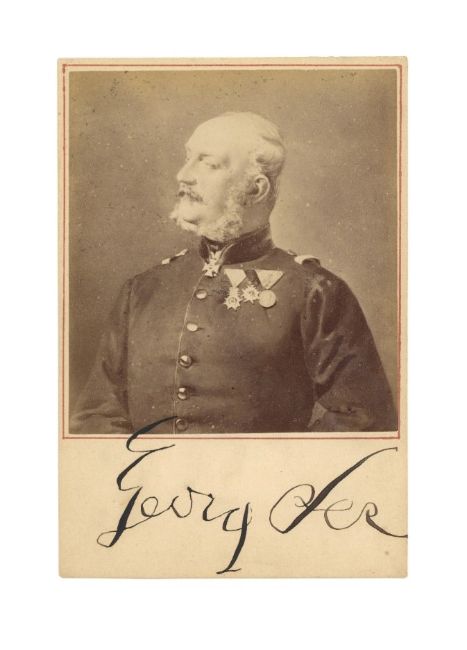 Cabinet card featuring the King of Hanover in his uniform in a three-quarter length pose, signed (‘Georg Rex’) on the lower portion of the mount, pencil annotations on the verso, 16.2 x 10.7cm.