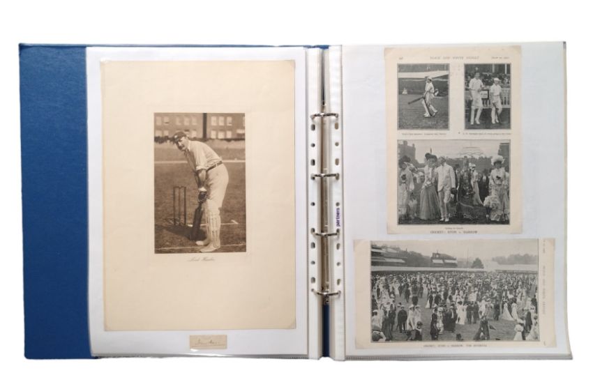 A large collection of cards and autographs by various prominent cricketers, including: Spencer Ponsonby-Fane, Isaac Donnithorne Walker, W.G. Garce (autograph note to an unknown recipient, reading "I shall be playing at Lords September 15-16 and could see you then if you could be there", one page, vertical crease, some browning, 8vo, 28 August n.y., and clipped signature), P.F. Warner, Martin Hawke, Reggie Schwarz, Ernie Hayes, Lionel Palairet, K. S. Ranjitsinhji (signed album page), H. D. G. Leveson Gower, H. Myers, S. Cadman, W.E. Bates, Fred Holland. Charlie Macartney,H, Young, Willie Quaife, John William Henry Tyler Douglas, Percy Fender, Roy Kilner, Jack Hobbs, Frank Mann, Jack Gregory, Herbert Sutcliffe, I.J. Siedle, Bob Wyatt, George Paine, Hans Ebeling, Don Bradman (three signed album pages) M. Garland-Wells, Percy Holmes, Eric Dalton, Les Darling, Ellis Achong, D.R. Jardine, Jack Fingleton, Ellis P. Robinson, Bill Voce, Learie Constantine, the Indian 1946 team, Harold Dawson, Bruce Dooland, Jack Young, Ted Lester, Fred Feer, Billy Griffiths, Jack Robertson, Denis Compton, Bert Sutcliffe, Tony Pawson, Leslie Compton, Len Hutton, John Warr, Geoff Rabone, Ray Lindwall, Vic Wilson, Rupert Webb, Godfrey Evans, Freddie Trueman, Herbert Doggart, Eric and Alec Bedser, George Tribe, Bob Appleyard, Colin Cowdrey, Ian Johnson, Godfrey Evans, Trevor Bailey, Derek Upton, Fred Troeman, Ted Dexter, Graeme Pollock, Don Wilson, Peter Graves, Garfield Sobers (signed album page), Ron Headley and many others, also including: sets of signatures by several counties, including Middlesex, Essex,Lancashire, Nottinghamshire, Somerset, Yorkshire and Sussex, clipped newspaper pages and photographs related to matches and players, v.s. early 20th century-c. 1960s (large quantity)