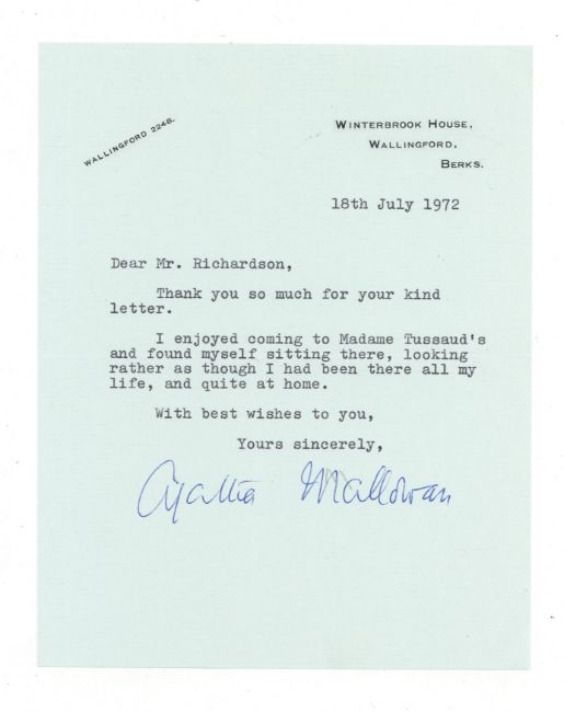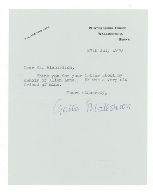 Two typed letters signed ('Agatha Mallowan') to Mr Richardson. One letter thanks him "for my memoir of Allen Lane" and adding "He was a very old friend of mine", one page, 27 July 1970; the second letter reads "I enjoyed coming to Madame Tussaud's and found myself sitting there, looking rather as though I had been there all my life, and quite at home", one page, 18 July 1972; both 8vo, Winterbrook House, Wallingford. Sold together with: a typed letter from Agatha's husband Max Mallowan, thanking Mr Richardson for his condolences on Christie's passing 23 January 1976, and a letter from Max's second wife Barbara thanking Richardson for his "letter of sympathy and condolence", 31 August 1978 (4)