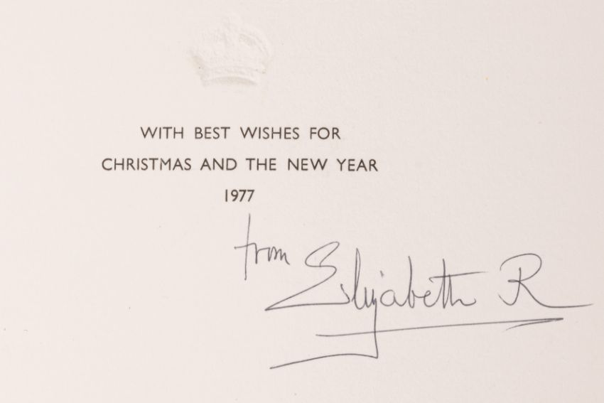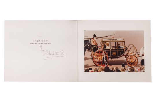 Christmas card from 1977, sent to a senior member of the Sandringham Household, signed inside below a printed Christmas and New Year's greeting "from Elizabeth R.", embossed royal crown on the front, with a photo of the Queen Mother and her grandchildren Prince Andrew and Prince Edward riding in a carriage affixed inside, 18.7 x 23.4cm