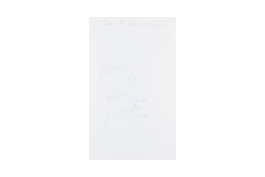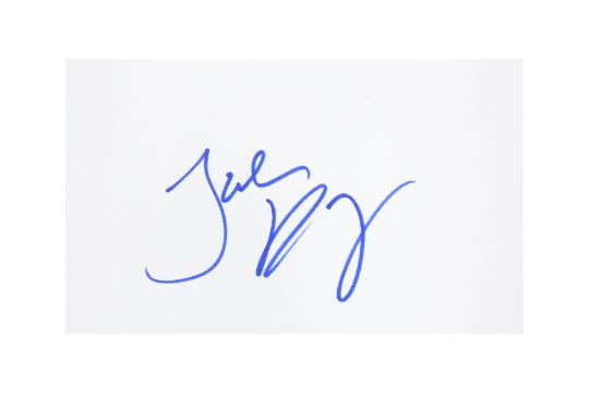 Large blue felt tip signature on white index card, 8 x 12.5cm.