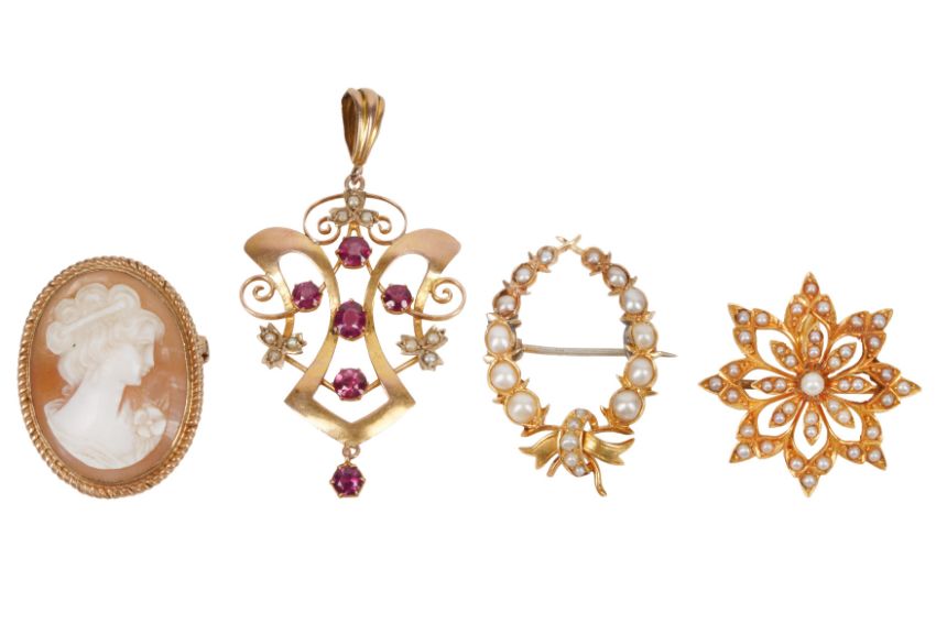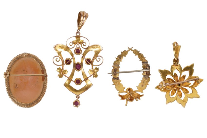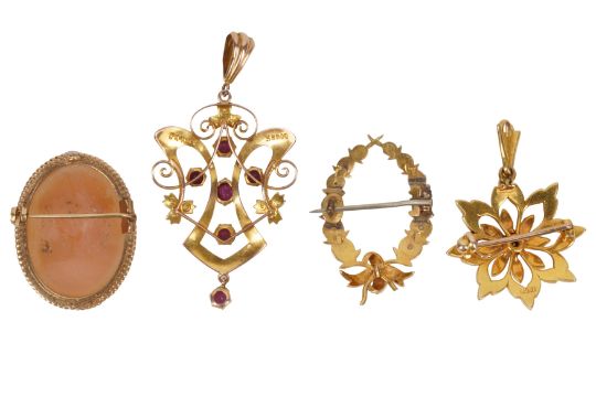 FOUR BROOCHES, To include a 9ct yellow gold shell cameo brooch depicting a classic profile of a woman looking right, to a rope-twist surround, maker's mark, UK hallmark, dimensions approx. 2.8 x 2.1cm; a seed pearl open-work flower design brooch/pendant, stamped '15C', length 3.4cm; a seed pearl open-work garland design brooch, metal unmarked and untested, length 3.1cm; a seed pearl and pink gemstones open-work pendant of geometrical and scroll design, maker's mark, stamped 'CT GOLD' only, length 5.0cm; total gross weight approx. 15.8 grams (4)