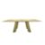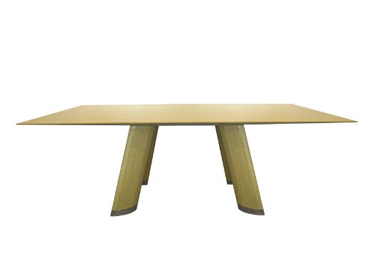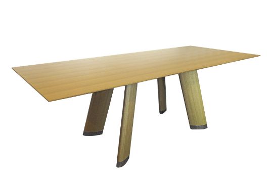 A CONTEMPORARY BESPOKE DINING TABLE, the rectangular lacquered wood table top raised over lacquered wood splayed supports, with chrome feet.