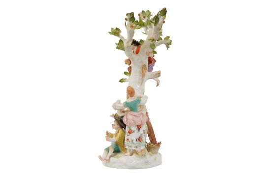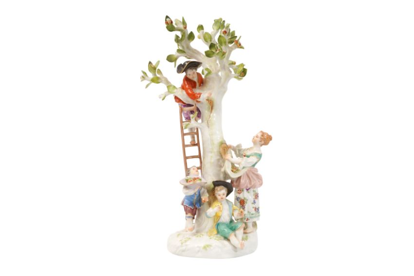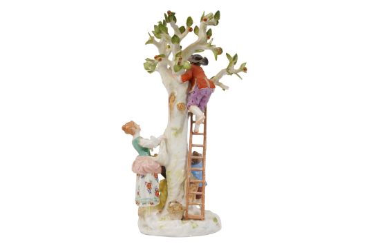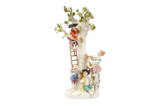 A MEISSEN FIGURAL GROUP OF APPLE PICKERS AFTER THE MODEL BY KÄNDLER AND MEYER, 19TH CENTURY, depicting a young boy barefoot at the top of a ladder resting against the fruiting tree, with three figures beneath gathering the apples in a hat and an apron, the underside with blue crossed swords mark, incised 1998 and 91.