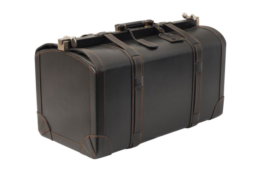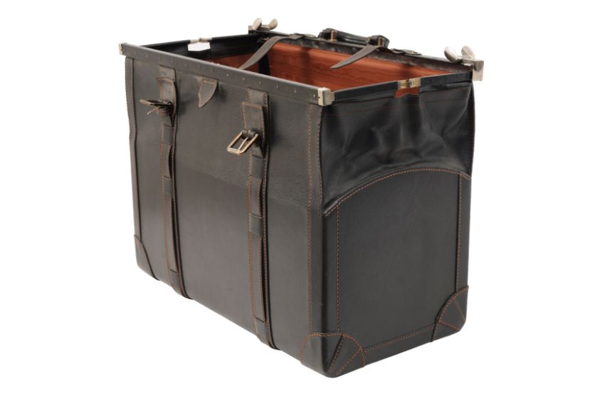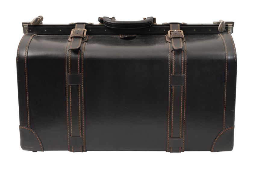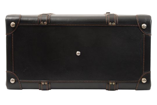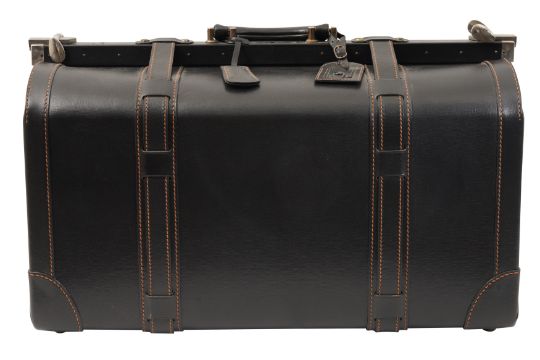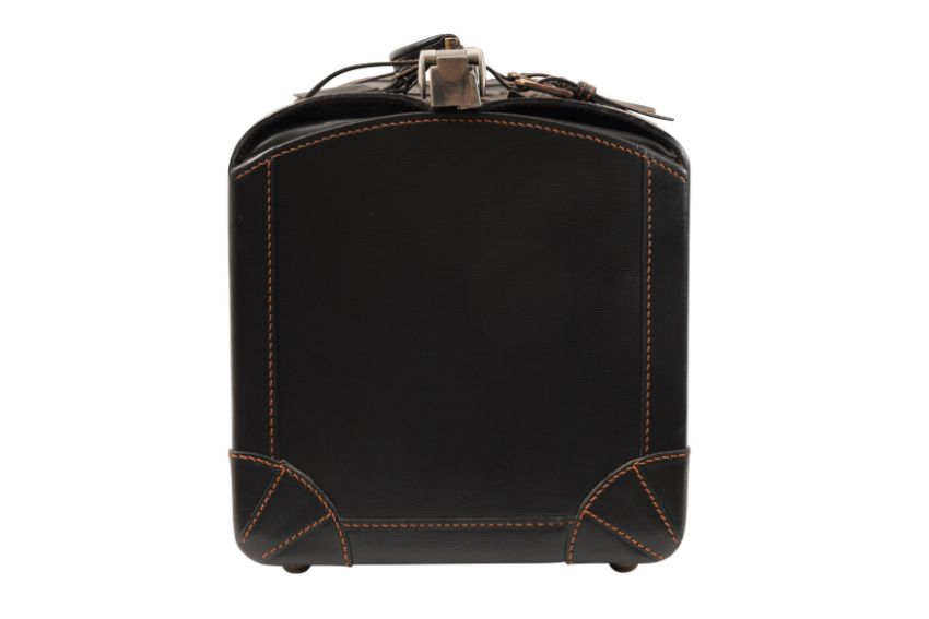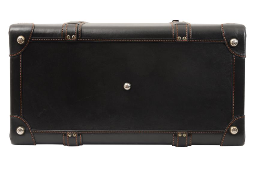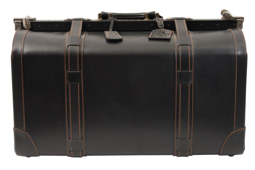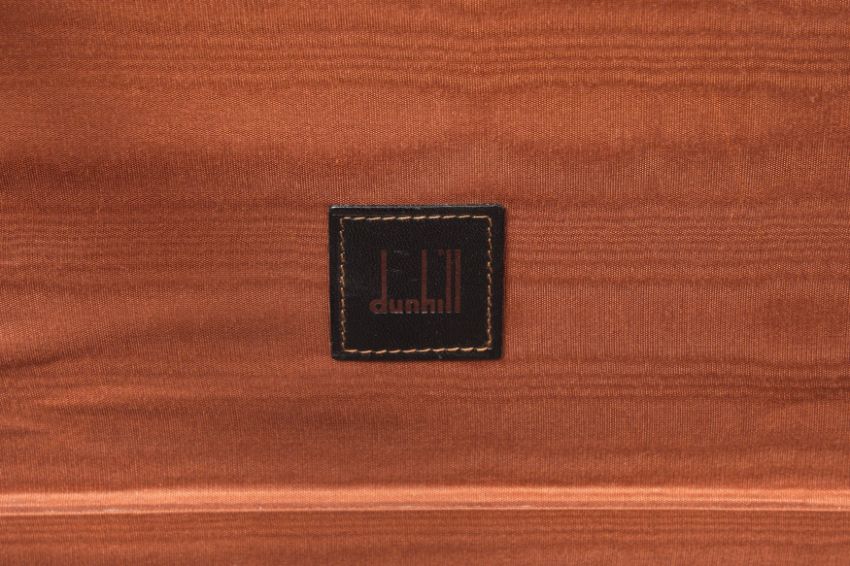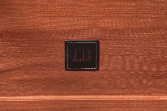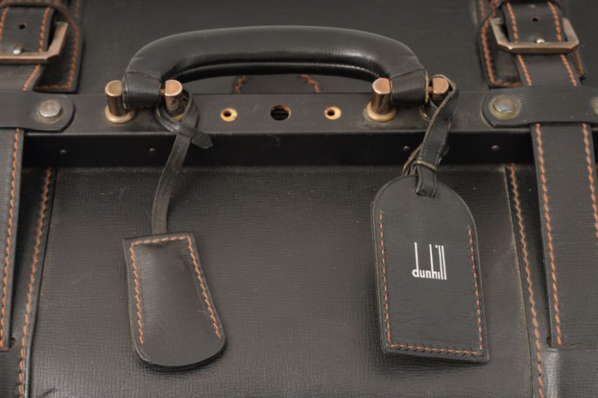 A DUNHILL GLADSTONE BLACK LEATHER BAG, the black leather with brown contrast stitching, and white metal hardware, the luggage tag marked 'Dunhill'.