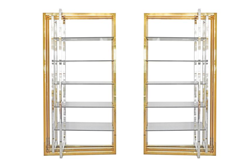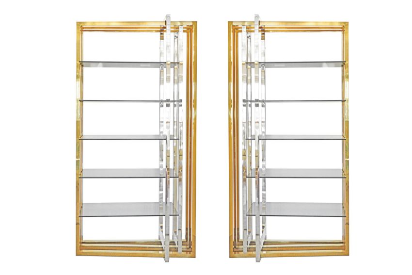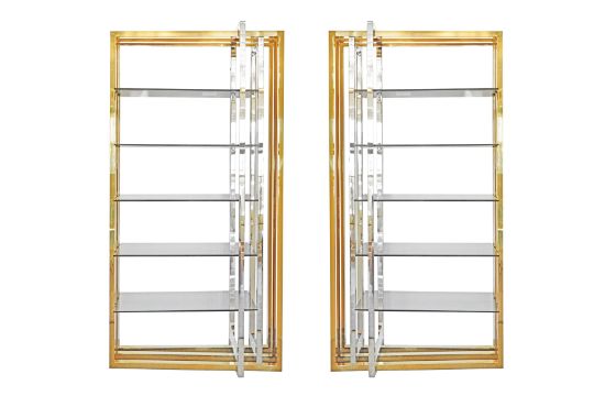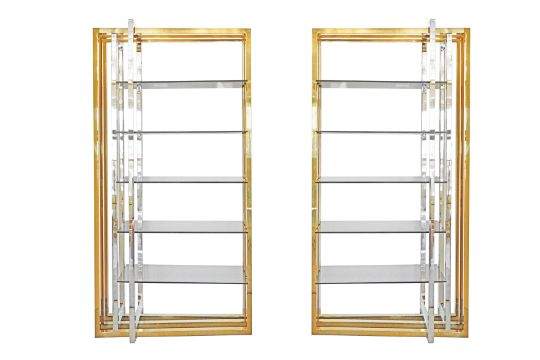 A PAIR OF BRASS AND CHROME SHELVING UNITS, in the manner of Willy Rizzo, with square section tubular frames, each with five glass shelves.