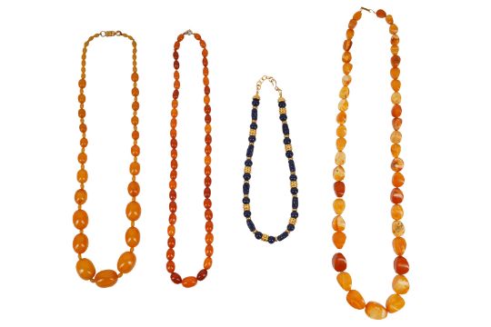 FOUR NECKLACES, To include a graduated oval-shaped amber imitation bead necklace, spaced by tubular amber beads, to a decorated box clasp, length 68.0cm; a graduated faceted oval-shaped bead amber necklace, length 68.5cm; a graduated oval-shaped bead amber necklace, length 65.0cm; a beaded necklace made of circular and tubular-cut blue beads, interspaced by yellow metal beads, signed 'Monet', length 44.0cm; all metal unmarked and untested, total weight of amber necklaces approx. 205.5 grams (4)