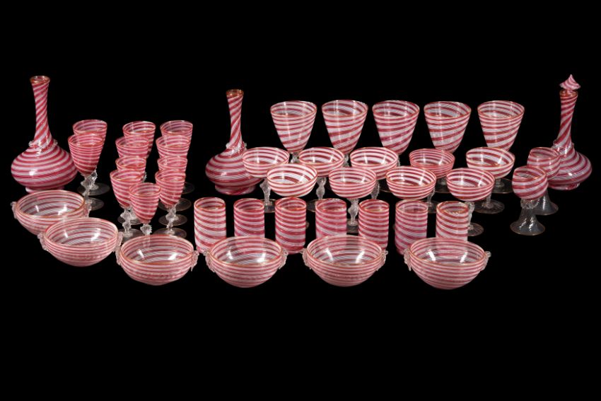 A SUITE OF VENETIAN LATTICINIO SWIRL GLASSWARE, LATE 19TH OR EARLY 20TH CENTURY, possibly Salviati, internally decorated with alternating spiral ribbons in opaque white, rose pink and aventurine, comprising a pair of carafes, 20cm high, a decanter, 26cm high, with stopper, a pair of roemers, 11.5cm high, five large goblets, 16.5cm high, six medium goblets, 13cm high, five small goblets, 12cm high, nine champagne coupes, 10.5cm high, seven tumblers, 9cm high, and six bowls with twin cherub mask handles, 13cm diameter (very minor losses and small chips to the aventurine footrims of some pieces, three pieces with short internal fractures, one bowl with section of rim re-stuck) (43)