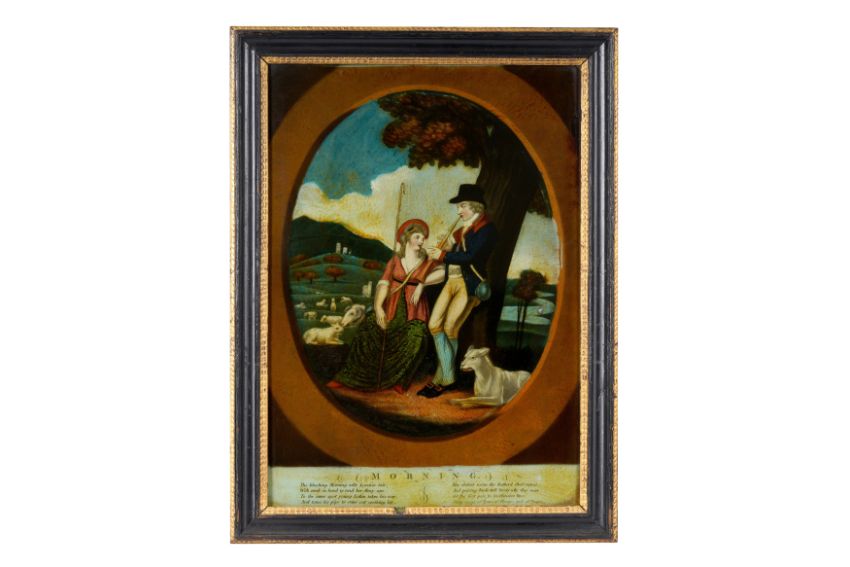 A GROUP OF NINETEEN REVERSE-PAINTED PRINTS ON GLASS PLUS A PAINTING ON GLASS.