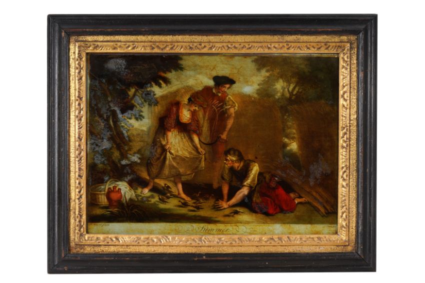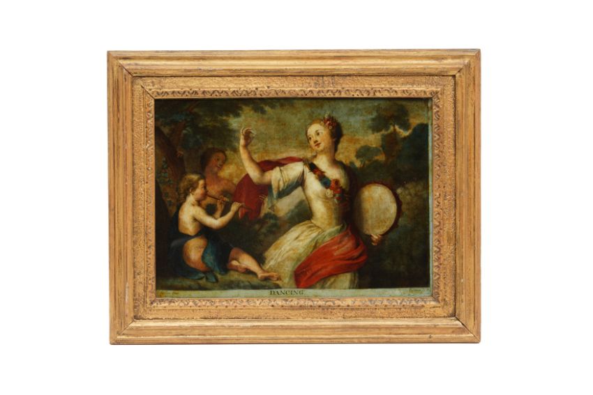 All dating to the late 18th Century & early 19th century, the group to include a variety of scenes and themes, showcasing detailed artistry and vibrant colors, Including "Morning," depicts a pastoral scene with a shepherdess and shepherd in a scenic landscape. The second painting captures a dynamic hunting scene with horsemen and hunting dogs. "Dancing" portrays a joyous scene with a central female figure and cherubs, set against a lush background. The "Summer" illustrates a rustic agricultural scene with figures engaged in harvesting activities. "Geography" features an allegorical representation with a central female figure holding a globe, accompanied by cherubic figures. Each is framed in either ornate gold or dark wood frames with gold inner borders (19 in group)