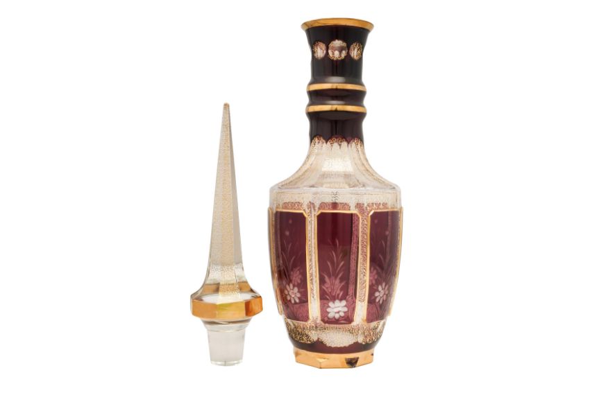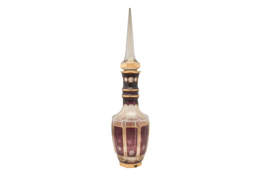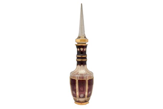 A LARGE BOHEMIAN GLASS DECANTER, MOSER OR JOSEPHINENHUTTE, CIRCA 1900, with a tall octagonal faceted and vermicelli decorated stopper, the neck with two gilt rings, over an octagonal section body, each with an amethyst coloured panel and with vermicelli decoration.