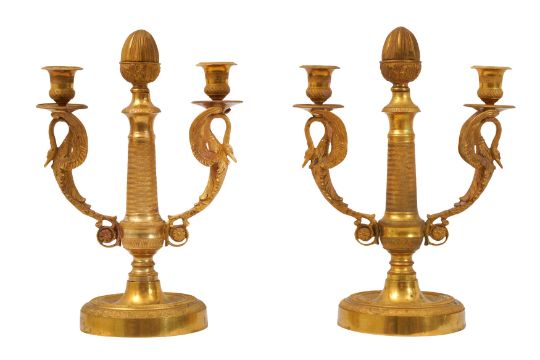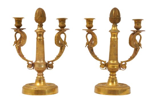 A PAIR OF FRENCH GILT METAL TWIN BRANCH CANDELABRA, 19TH CENTURY, the central engine turned stem issuing branches in the form of cast swans with outstretched wings, on a circular base. (2)
