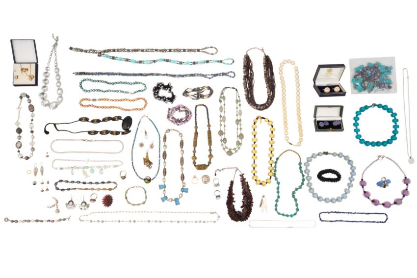 A GROUP OF COSTUME AND SILVER JEWELLERY, To include necklaces, bracelets, rings, earrings, pendants, cufflinks, a brooch, some loose beads, and a mother-of-pearl paper cutter (Qty)
