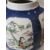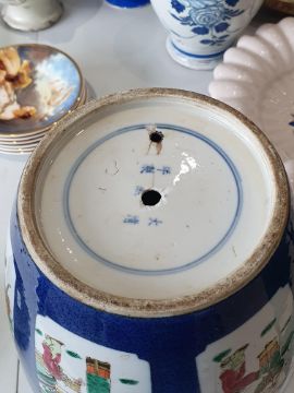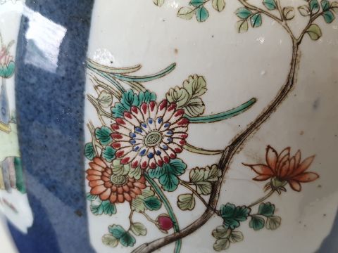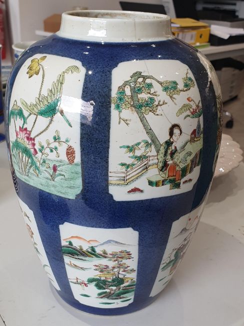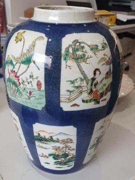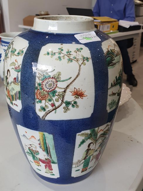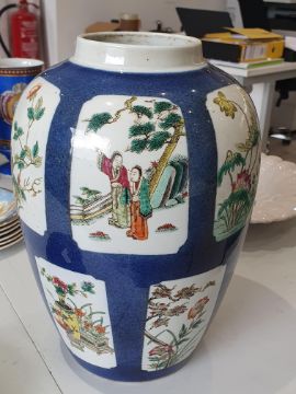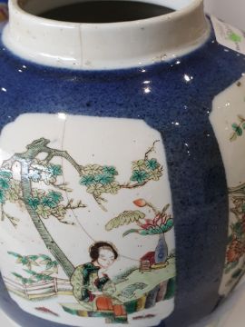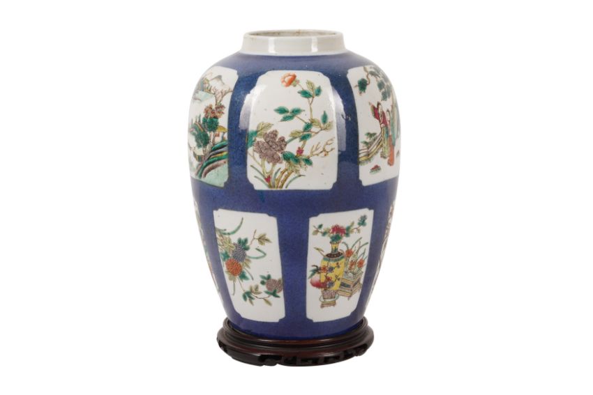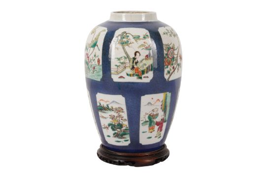 A CHINESE FAMILLE-VERTE POWDER-BLUE JAR, 19th Century, the slender ovoid jar painted with panels enclosing figurative and landscape scenes reserved against a powder-blue ground, the base with a six-character Kangxi mark in underglaze-blue, raised on a wood stand, 31.5cm high (2)