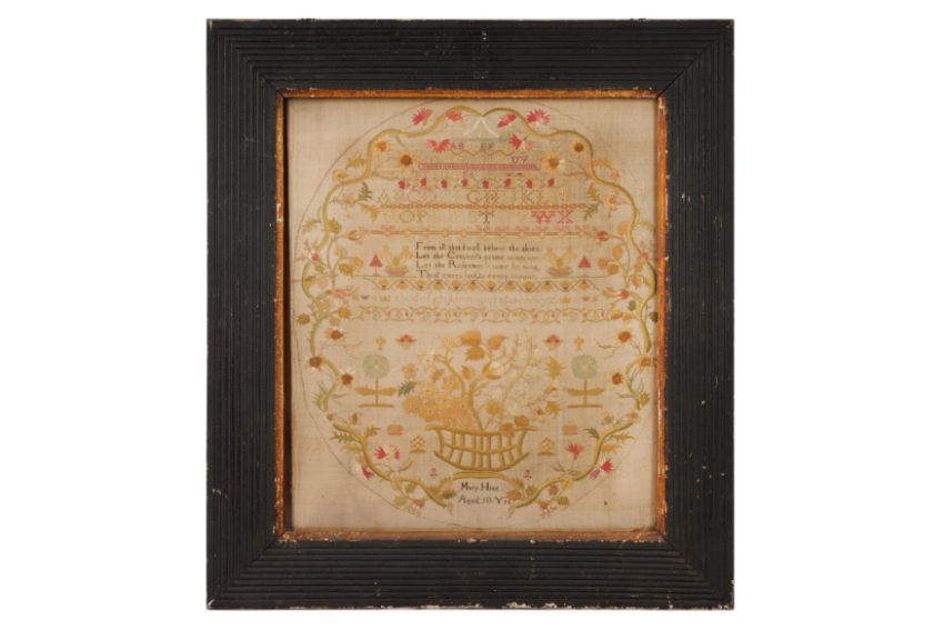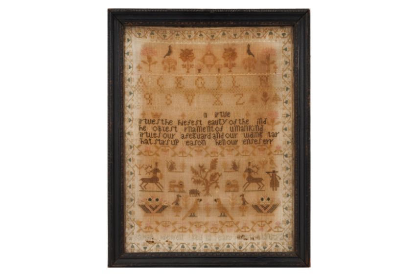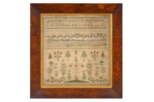 A GROUP OF THREE GEORGIAN SAMPLERS, the group comprising of a late 18th-century example by Sarah Hewett aged 12 years in 1792, an example by Eliza Aldis, aged 13 in February 1828, and another late 18th-century example by Mary Hine age 10, all examples with various verses and variously stitched with trees, flowers, birds, lions and horses (3)