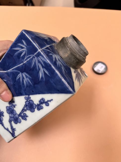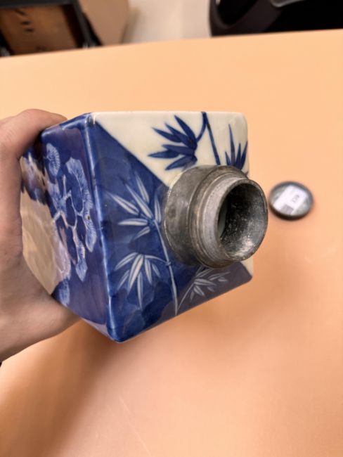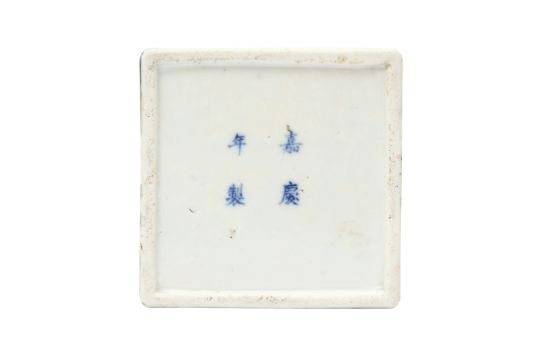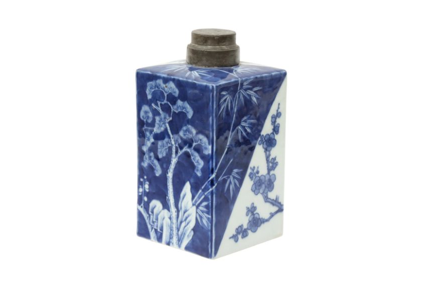 The square-form caddy painted with pine, bamboo and prunus to form the suihan sanyou against both white and dark-blue grounds, with a pewter rim and cover, the base with a four-character Jiaqing mark,