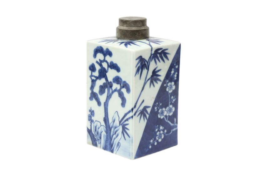 A CHINESE BLUE AND WHITE 'THREE FRIENDS OF WINTER' TEA CADDY