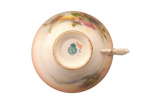 AN EDWARDIAN HAND PAINTED ROYAL WORCESTER TEA SERVICE, DATE MARK FOR 1907, painted with roses on a blush ground, comprising a teapot, a milk jug, a sugar bowl, four tea cups and four saucers, bearing teal stamp, painters mark, and monogrammed James Hadley mark. (11)