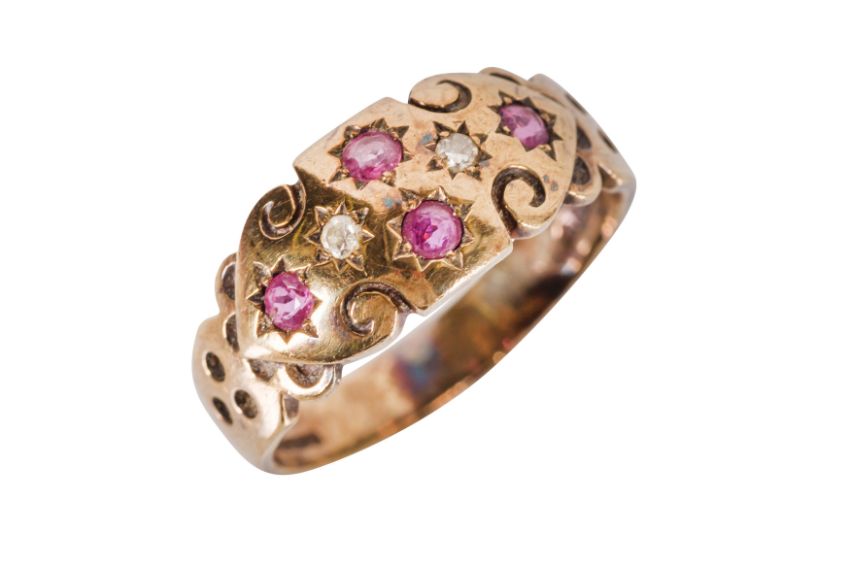 A RUBY AND DIAMOND RING, CIRCA 1988, The 9ct yellow gold band, set with four circular-cut rubies and two round single-cut diamonds, on a decorated tapered band, maker's mark 'PMLd', UK hallmark, ring size N, weight 3.2 grams
