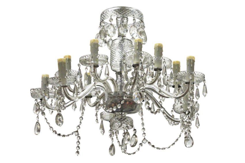 A TWELVE BRANCH GLASS CHANDELIER, 2OTH CENTURY, with a baluster and inverted baluster stem, the C scroll arms hung with faceted teardrop lustres.