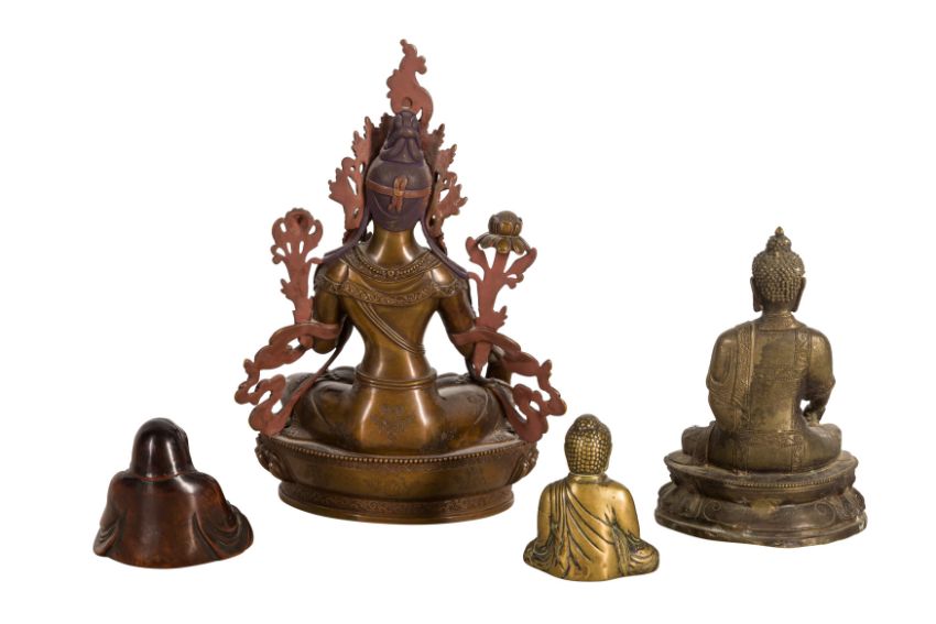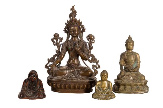 A GROUP OF THREE CHINESE BRONZE FIGURES AND A JAPANESE WOOD NETSUKE, 19th - 20th Century, comprising a figure of Tara sat in dhyana sana atop a lotus base and set with faux jewels, a figure of Shakyamuni Buddha, a small polished bronze figure of Shakyamuni Buddha, and a Japanese carved wood netsuke depicting a robed monk, unsigned, 7.5 - 23cm high (4)