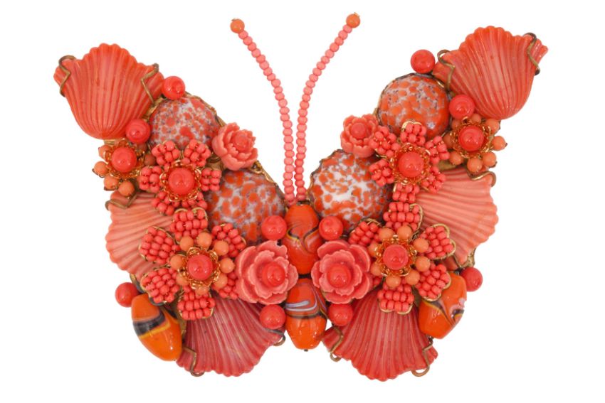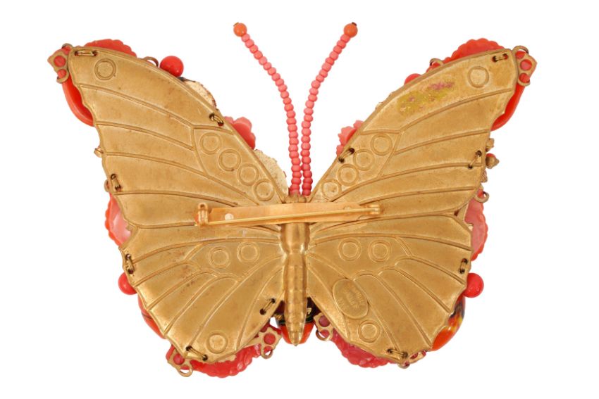 A STANLEY HAGLER ORANGE BUTTERFLY BROOCH, The costume jewellery brooch features a 3-D multi colour orange, red, and pink butterfly with intricate glass flowers and beads, signed 'Stanley Hagler N.Y.C.', dimensions approx. 10.2 x 7.0cm, together with a box
