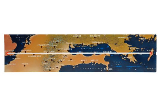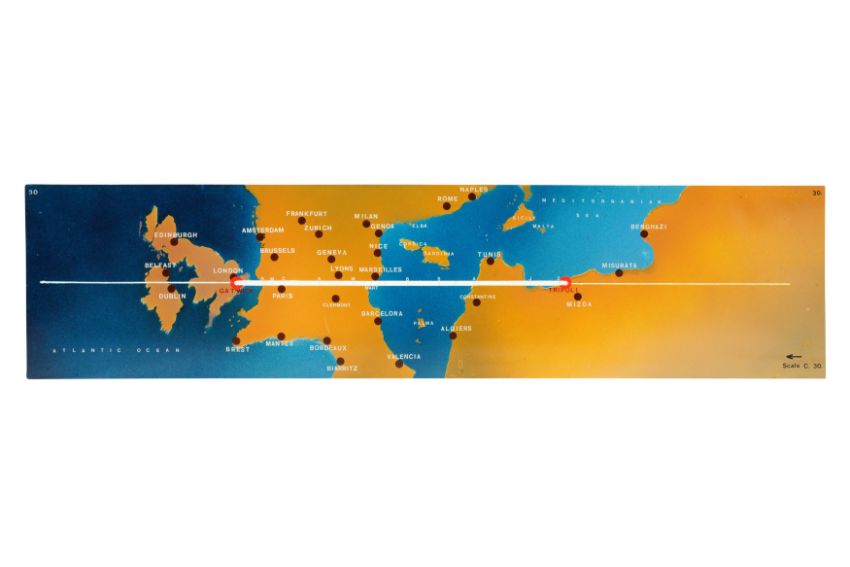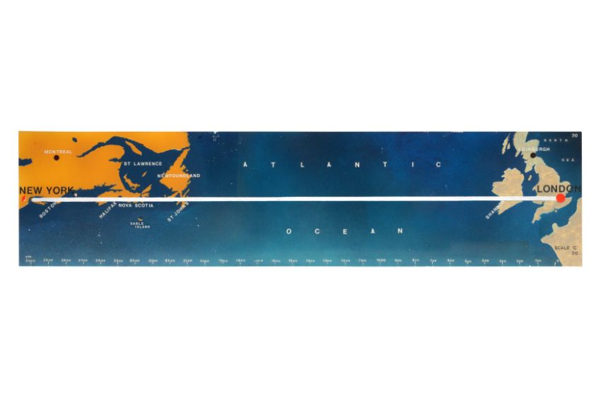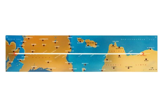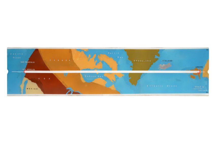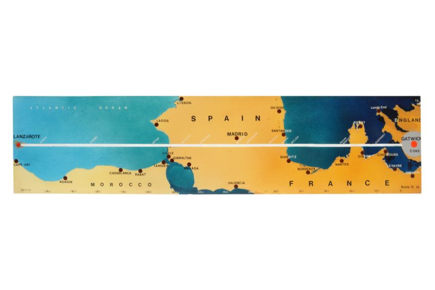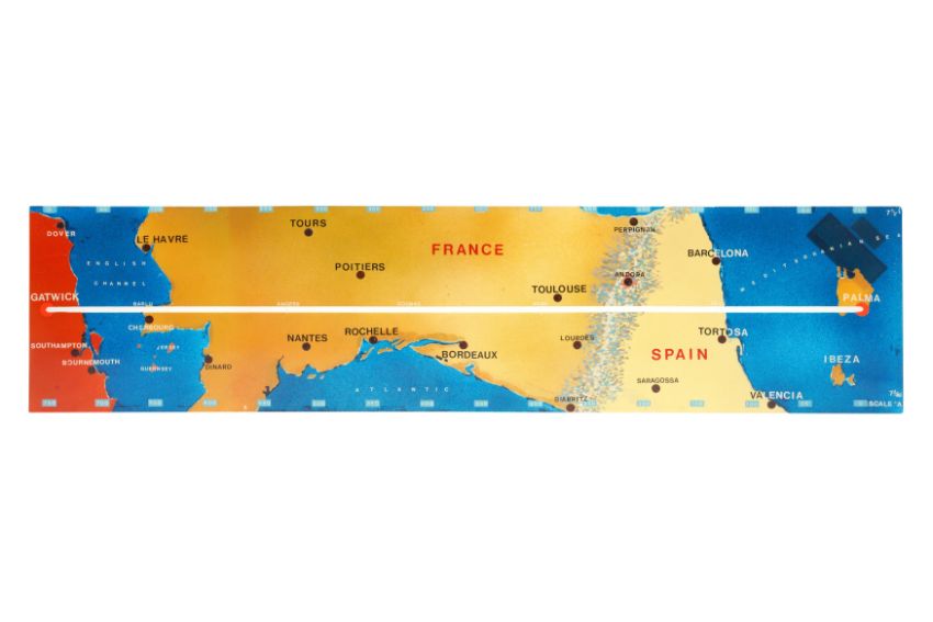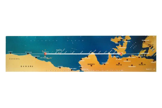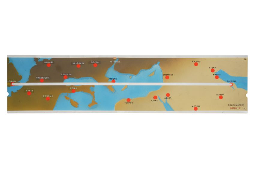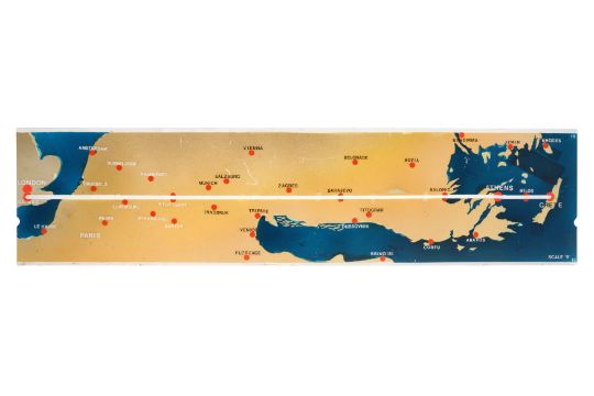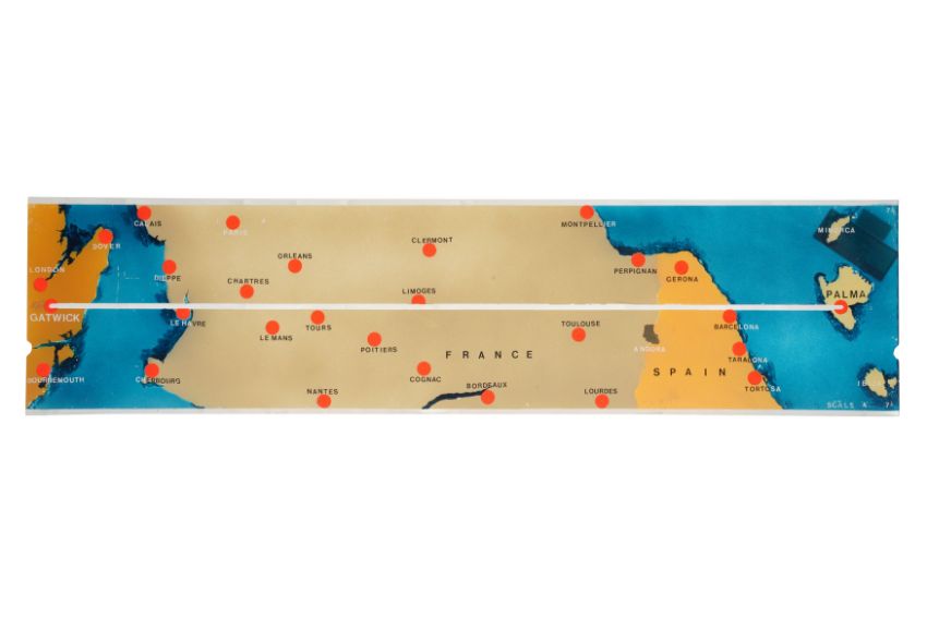 A SET OF ELEVEN PAINTED PERSPEX AVIATION 'ROUTEMARKER' FLIGHT MARKERS, MID 20TH CENTURY, presumably from a control room, designed to display the progress of planes, including from Gatwick throughout Europe and beyond. (11)