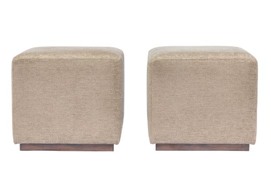 A PAIR OF SOFA AND CHAIR COMPANY CONTEMPORARY FOOT STOOLS, upholstered in a brown fabric, interwoven with metallic thread, raised on a square base.