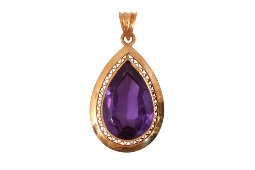 A SYNTHETIC COLOUR-CHANGE SAPPHIRE PENDANT, The pear-shaped synthetic colour-change sapphire set centrally in a pierced and polished mount surround, to a textured loop, metal unmarked and untested, weight 11.6 grams