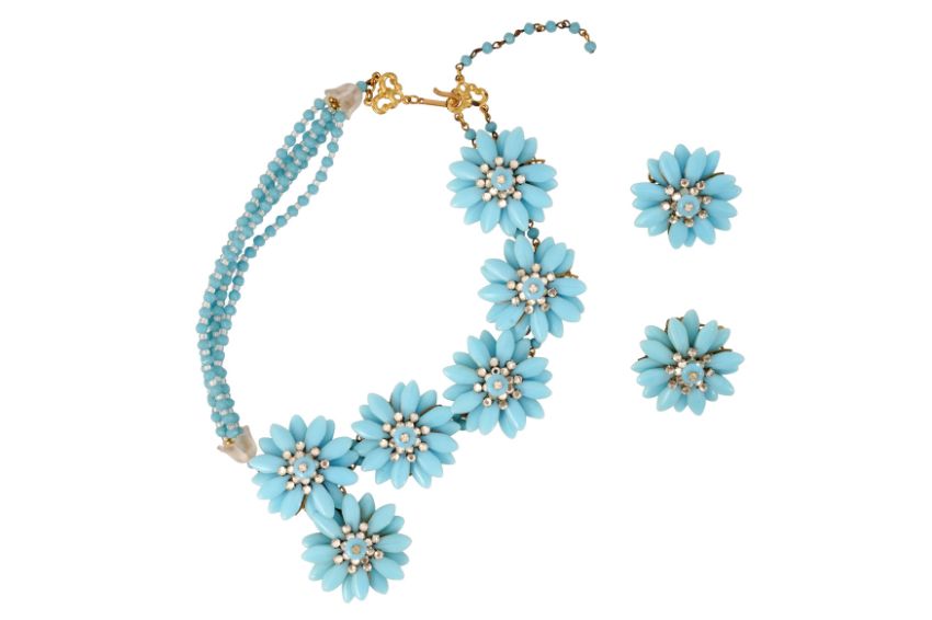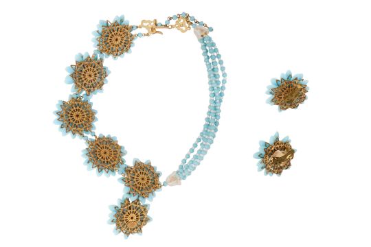 A STANLEY HAGLER BLUE FLOWERS NECKLACE AND CLIP EARRINGS SUITE, The costume jewellery necklace feature a 3-D sequence of blue and transparent glass flowers on one side, flanked by five rows of same-colour beads, to translucent bluebells ends, hook clasp and adjustable length, with matching earrings, both pieces signed 'Stanley Hagler N.Y.C.', necklace length approx. 48.5cm, diameter of earrings 4.0cm, together with a box