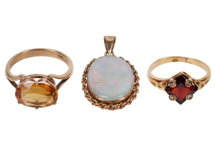 TWO RINGS AND AN OPAL PENDANT, To include a garnet and rose-cut diamond ring, to tapered decorated shoulders, metal unmarked and untested, ring size I½; an oval-cut horizontally gem-set ring, to a raised mount and bifurcated shoulders, undistinct stamp, ring size M½; an oval-cut cabochon white opal, on a rope-twist surround, stamped '9CT'; total gross weight approx. 8.2 grams (3)