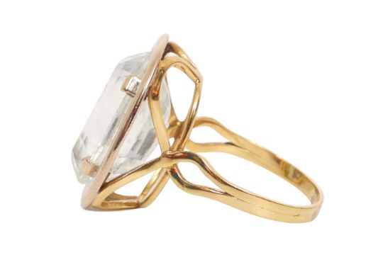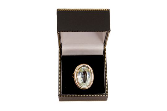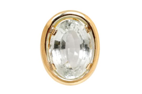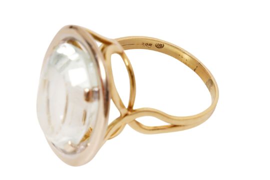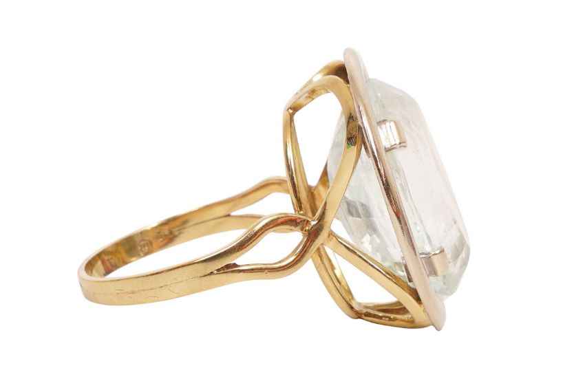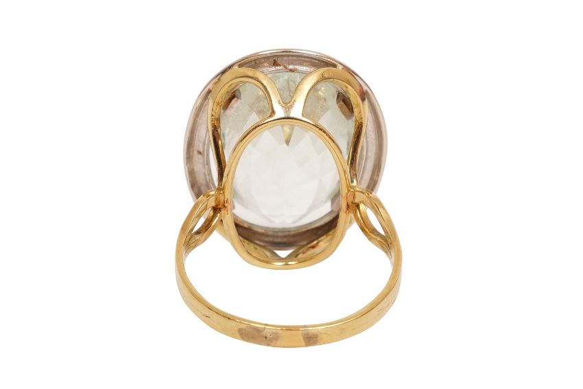 AN AQUAMARINE RING, The oval-cut aquamarine, in a four-claws setting, to an open-work polished surround in white metal, to a yellow metal raised open-work mount and open-work split intertwined shoulders, maker's mark, stamped '585', ring size Q½