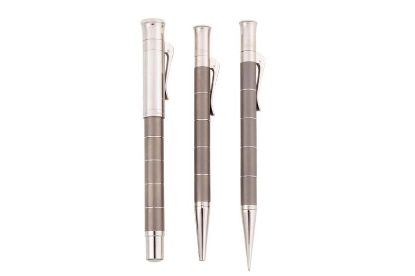 A GRAF VON FABRE CASTELL SET OF THREE PENS, The gray barrell segments separated by chrome additions, the Classic Anello serie of pens include a fountain pen, a roller-ball pen, and a pencil (3)