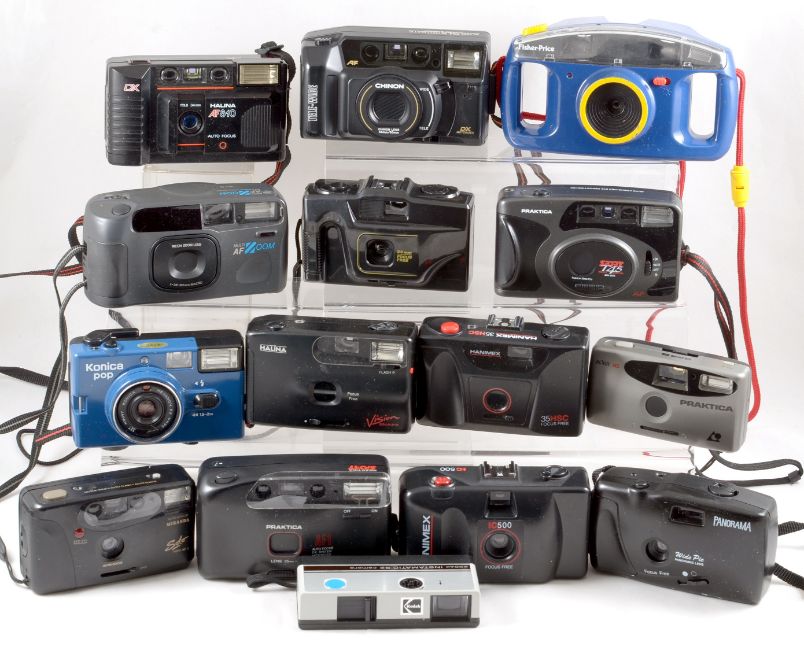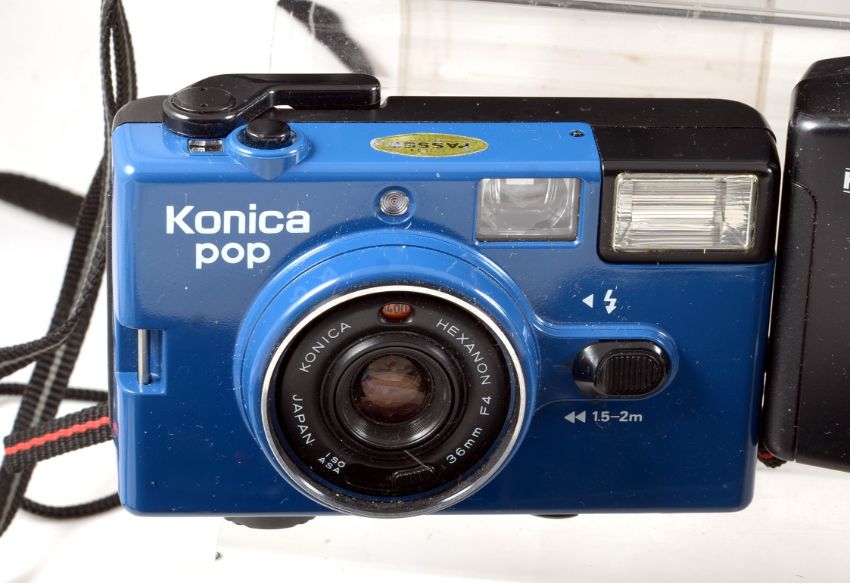 A Blue Konica Pop & Other Point & Shoot Cameras. Some boxed or with cases. All with shutters firing and, where fitted, working flash.
