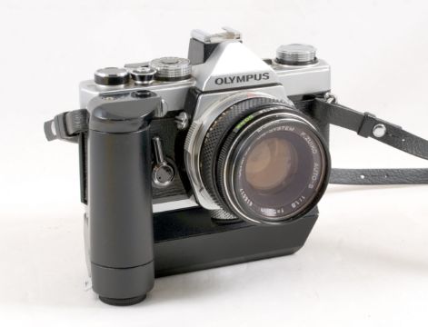 4-Lens Olympus OM-1 Outfit. Comprising an Olympus OM-1 #1067102. (Shutter firing, meter responsive) with ERC. Usual degradation to lower section of viewfinder, otherwise signs of normal use). With "silver nose" Zuiko 50mm f1.8 lens, Zuiko 135mm f3.5 (some internal fungus), Zuiko 35-70mm f4 zoom (blades very slightly slow, signs of normal use) and a Zuiko 75-150mm f4 zoom (signs of normal use). Also a working Winder 2. All in a heavy-duty Domke outfit bag.