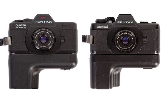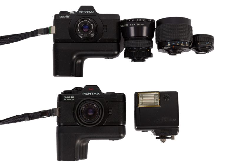 Auto 110 and Auto 110 Super camera bodies both with 24mm f/2.8 lens SMC Lenses