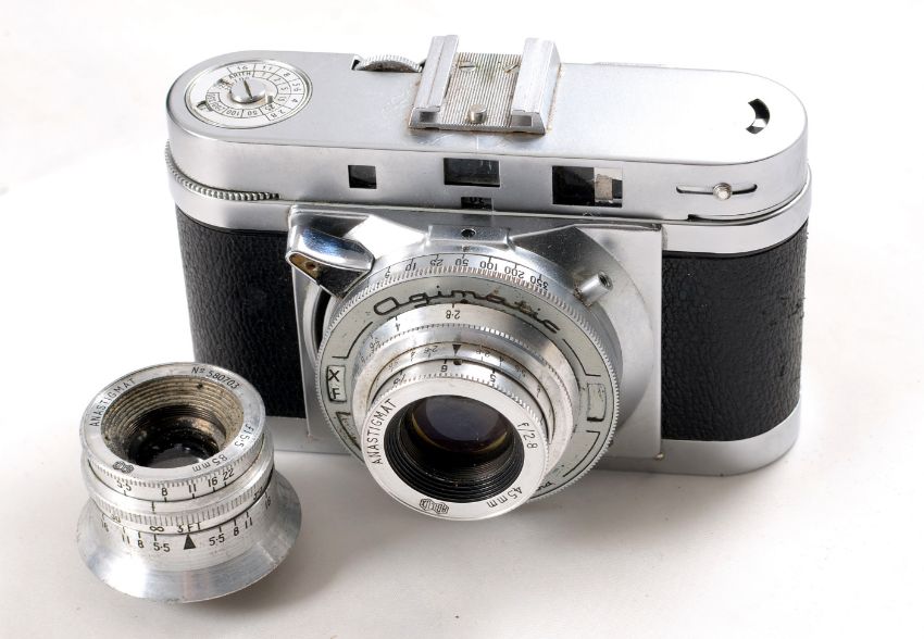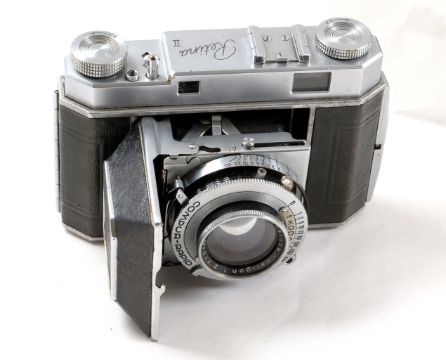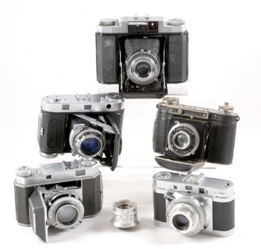 Comprising a Zeiss Ikon Nettax with Novar 75mm f4.5 lens (signs of normal use). Shutter firing, meter responsive; Balda Super Baldinette with Heligon 50mm f2 lens (signs of normal use). Shutter firing; Kodak Retina II with with Heligon 50mm f2 lens (signs of normal use). Shutter firing; Agimatic (shutter firing, RF suspect) with 45mm f2.8 & uncommon 85mm f5.5 lens (signs of heavy use). Also an uncommon Certo Kafota, shutter firing but release lever very slow or needs help returning before cocking.