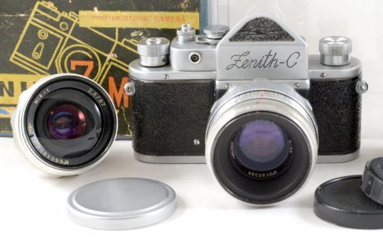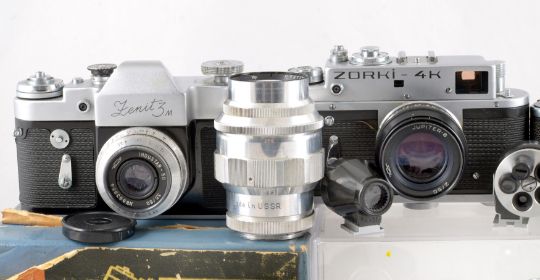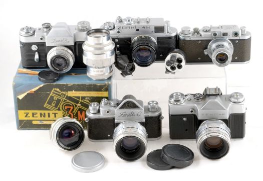 A Good Group of Soviet Cameras. To include Zenith B, Zenit 3 & 3M, Zorki 4K and a Zorki 1 Leica copy cameras, lenses and viewfinders. All with shutters firing and signs of normal use.