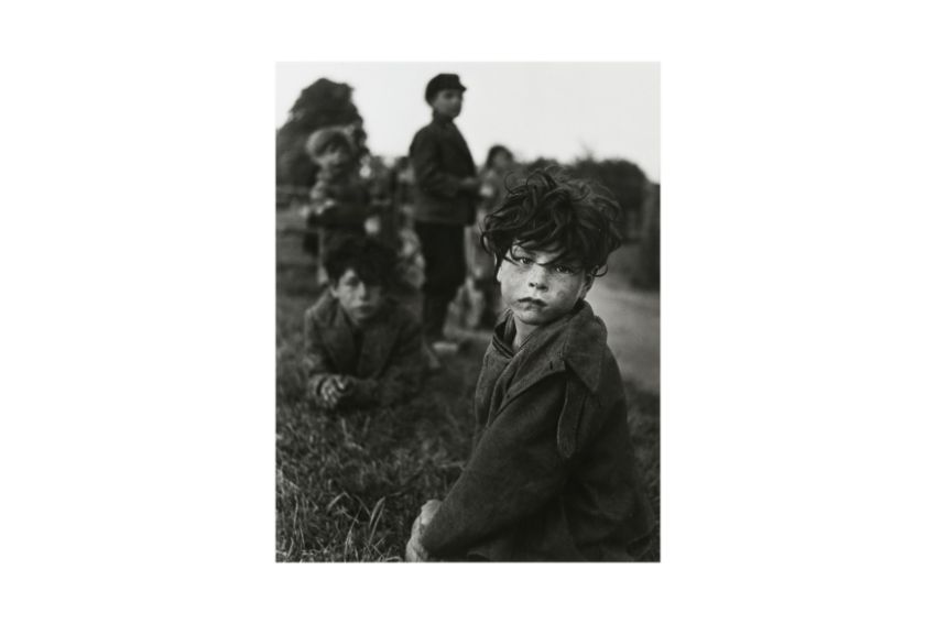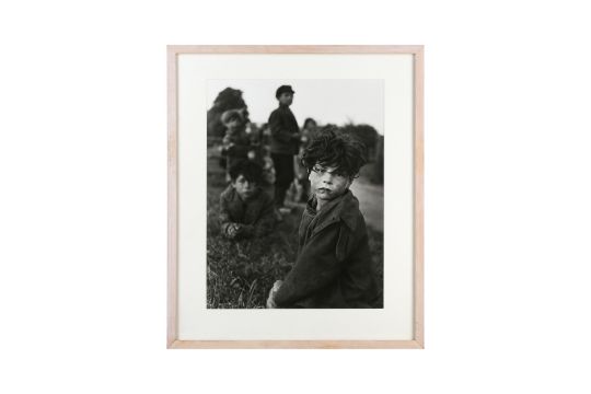 GYPSIES ON A GATED ROAD NEAR CHESTERTON WINDMILL, WARWICKSHIRE, OPENING GATES FOR CARS FOR A PENNY, c.1950. Silver gelatin print, image size 480 x 370mm, Framed, frame size 635 x 535mm, with Sadler's copyright credit label frame verso.