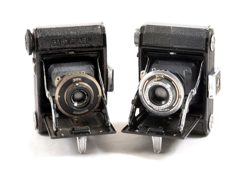 Three Uncommon 127 Roll Film Cameras. Comprising of a Konishiroku Baby with 50mm f4.5 Hexar lens in a Rox shutter; a Baby Pearl with a 520mm f6.3 Optar lens in a Rox shutter and a Vest Pocket Megor, helicoil focussing and with a Primotar 5cm f3.5 lens, features a neat, folding finder. Each with shutter firing.