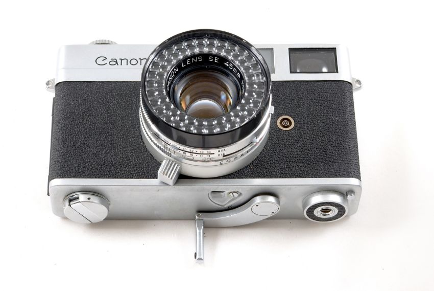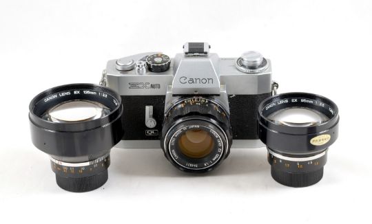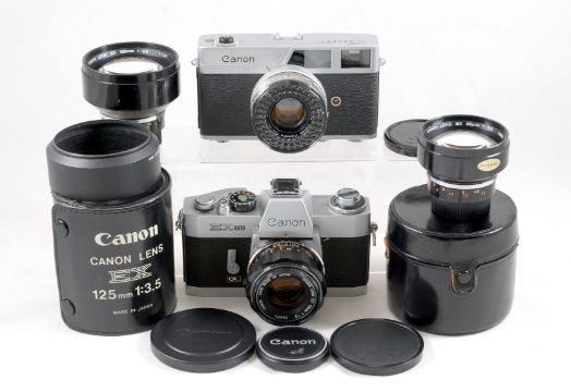 Canon EX Auto Outfit & a Canonet. Comprising an EX body #150224 shutter firing, meter not responding (signs of normal use) with EX 50mm f1.8, EX 90mm f3.5 & EC 125mm f3.5 lenses. Also a trigger wind, Canonet with 45mm f1.9 lens. Shutter firing and auto exposure operational. Signs of normal use) with ERC.