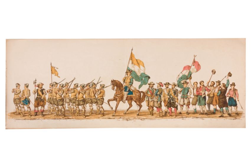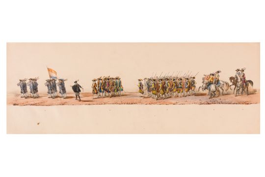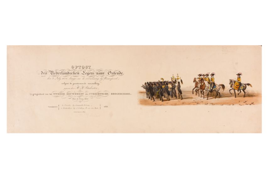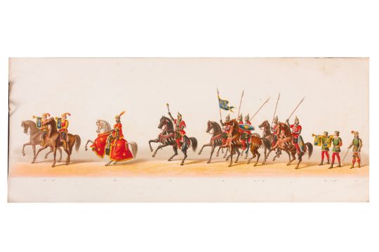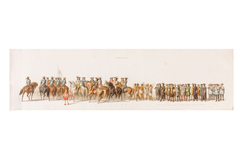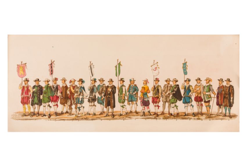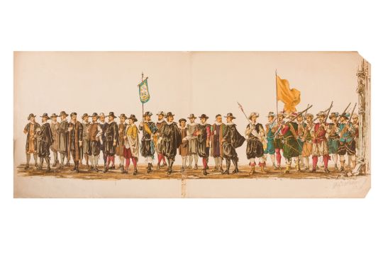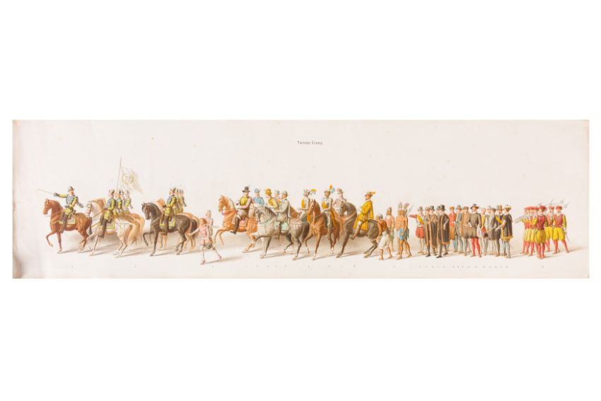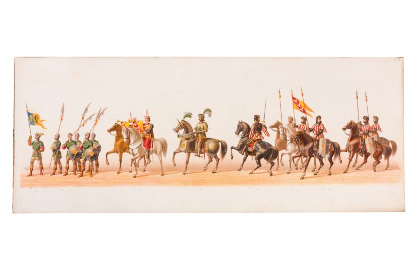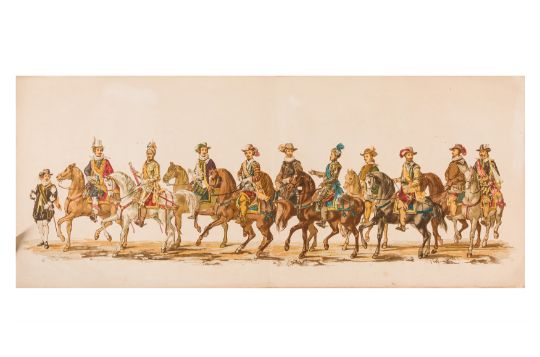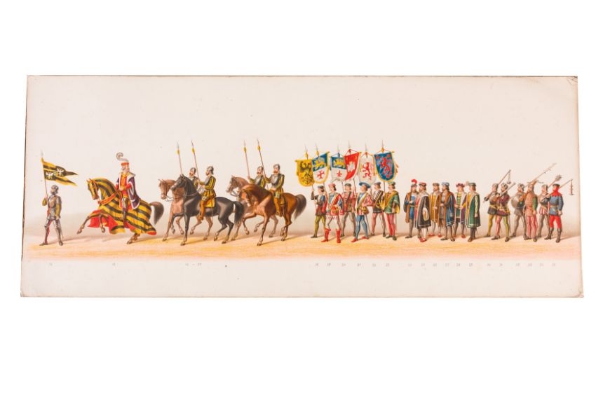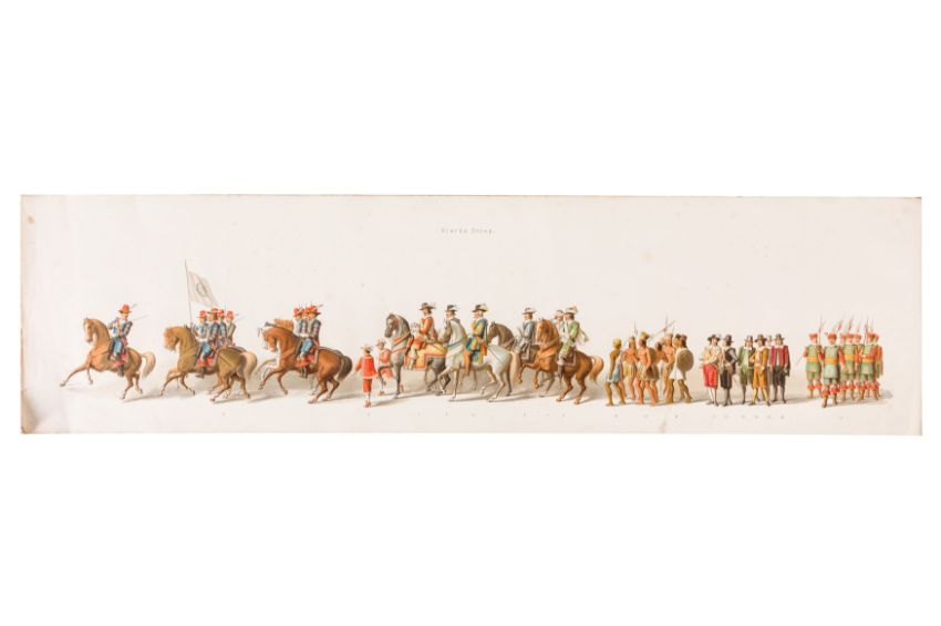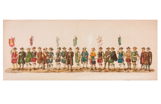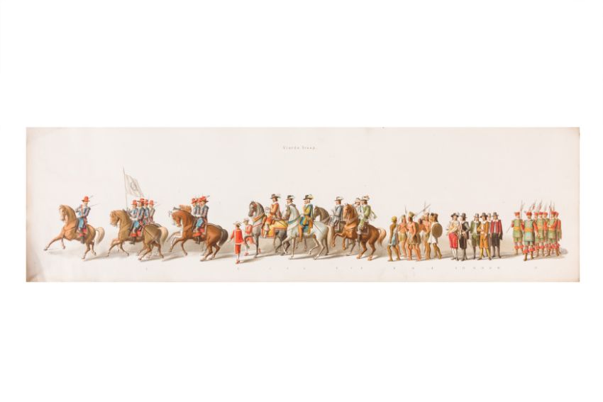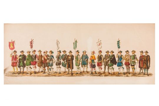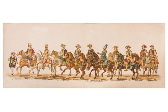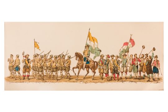 HISTORICAL PROCESSION FOR THE 2ND CENTENARY OF THE UTRECHT UNIVERSITY, 1836. Hand-coloured lithographic panorama by Victor Adam and Joseph-Rose Lemercier, from an untitled portfolio, published by Caramellie & Co. and A Collings & van den Hout., 1836. Comprising ten loose sheets, each measuring 228 x 625mm, housed in a portfolio measuring 245 x 645mm, title and publication details printed on the left of the first sheet; the artist's name printed on the right of the tenth sheet, each image numbered 1-43.This Dutch processional panorama commemorates the bi-centenary of the Utrecht High School (title print), 16 June 1836, including a re-enactment of the parade of the Dutch armies to Ostend, on 3 July 1600, the day after the victory at Nieuwpoort.