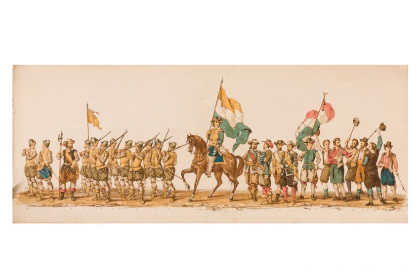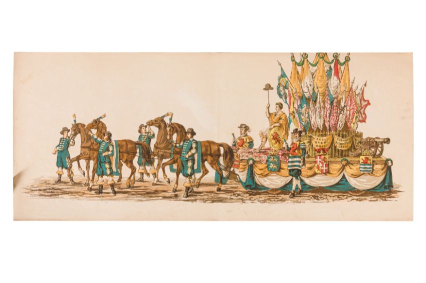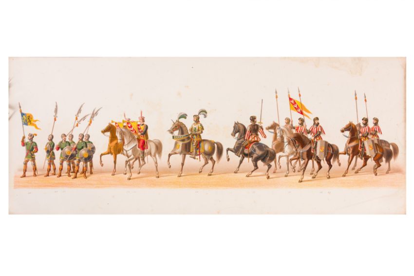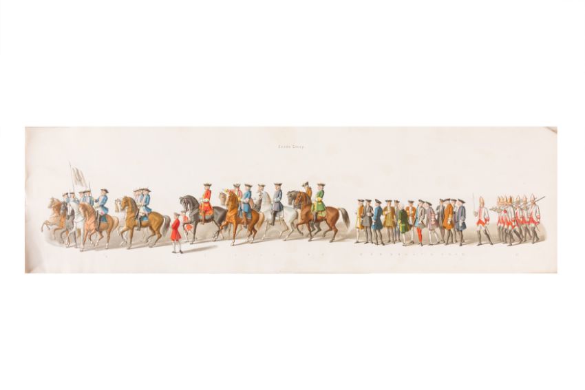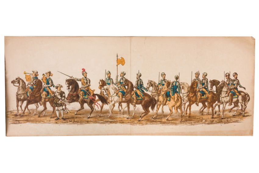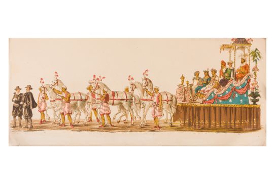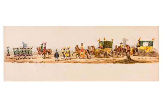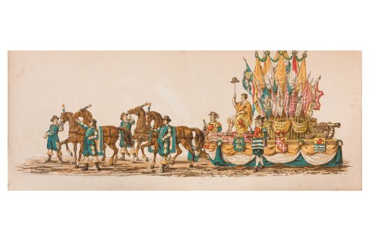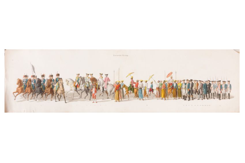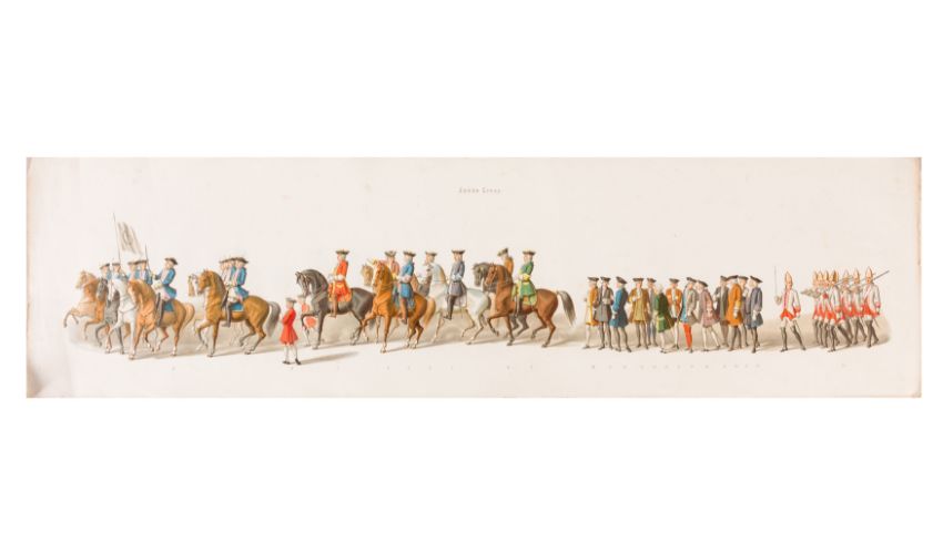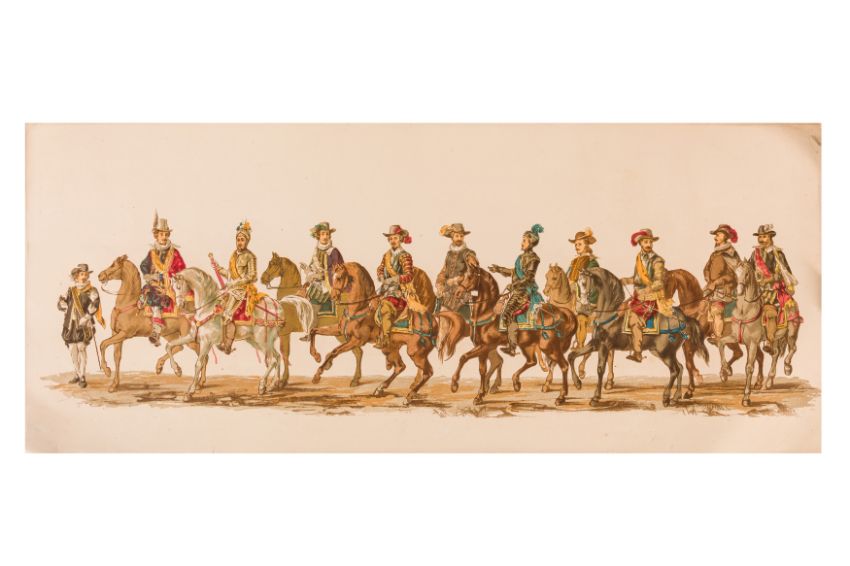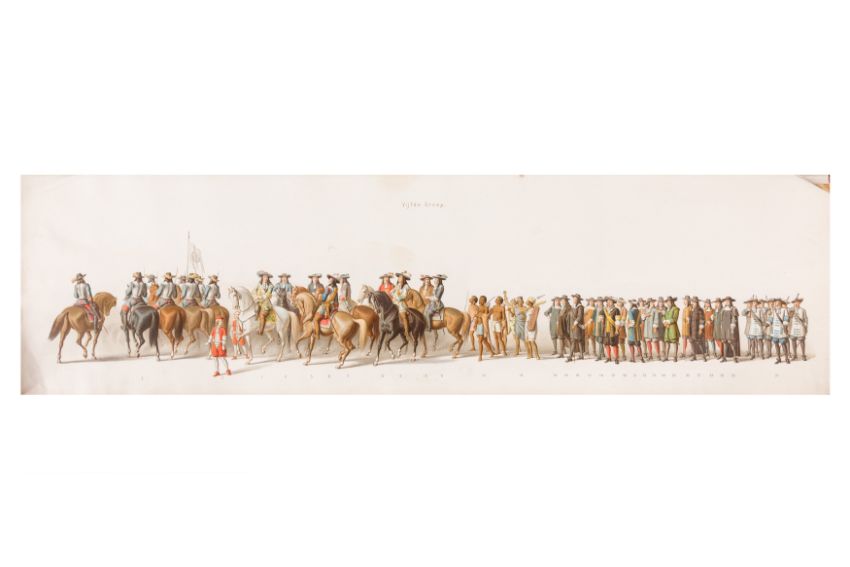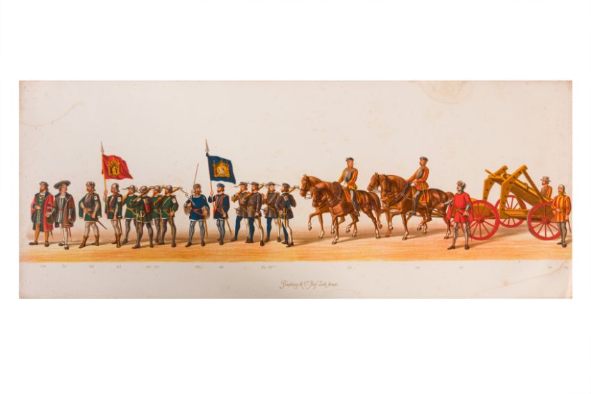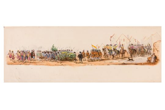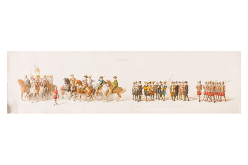 HISTORICAL PROCESSION FOR THE 2ND CENTENARY OF THE UTRECHT UNIVERSITY, 1836. Hand-coloured lithographic panorama by Victor Adam and Joseph-Rose Lemercier, from an untitled portfolio, published by Caramellie & Co. and A Collings & van den Hout., 1836. Comprising ten loose sheets, each measuring 228 x 625mm, housed in a portfolio measuring 245 x 645mm, title and publication details printed on the left of the first sheet; the artist's name printed on the right of the tenth sheet, each image numbered 1-43.This Dutch processional panorama commemorates the bi-centenary of the Utrecht High School (title print), 16 June 1836, including a re-enactment of the parade of the Dutch armies to Ostend, on 3 July 1600, the day after the victory at Nieuwpoort.