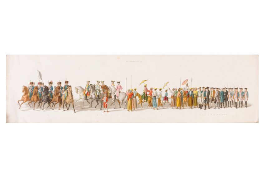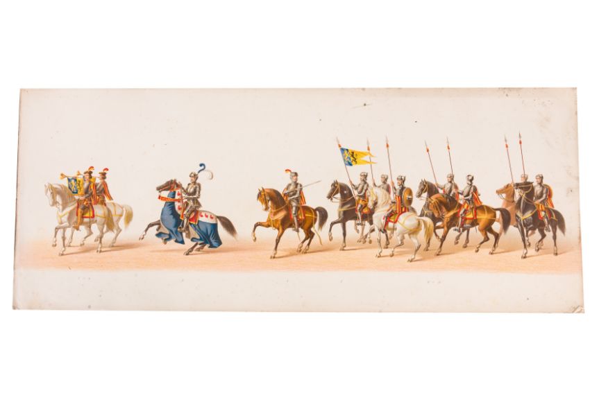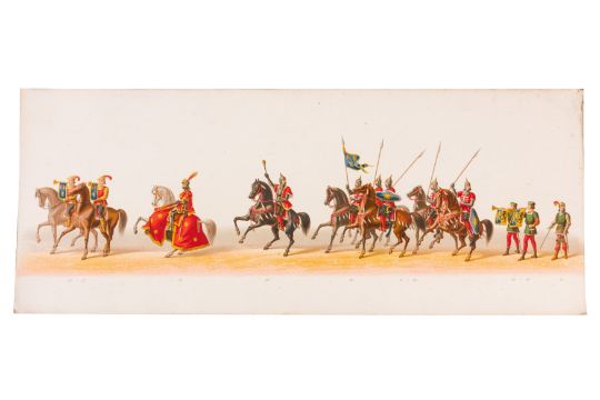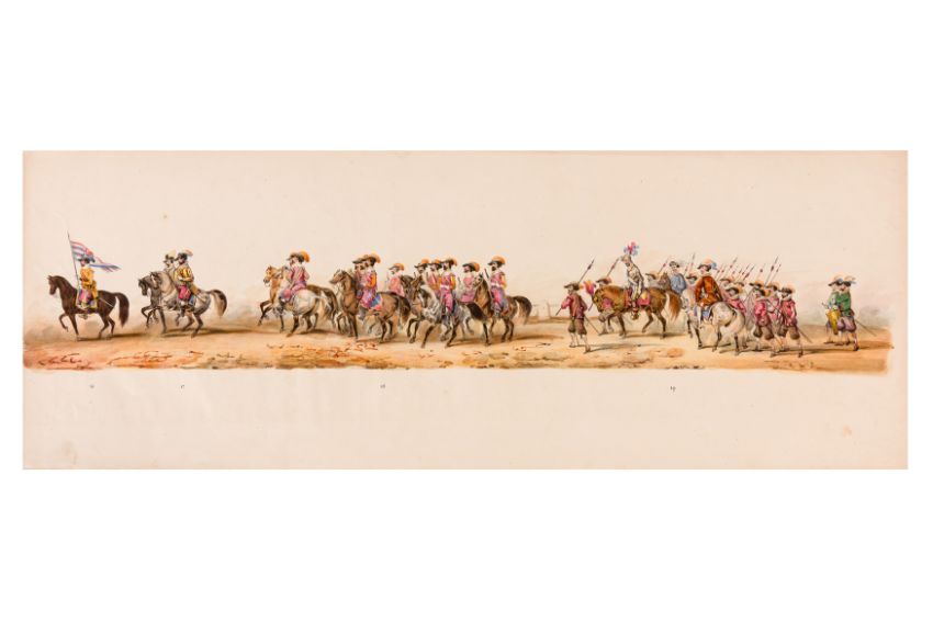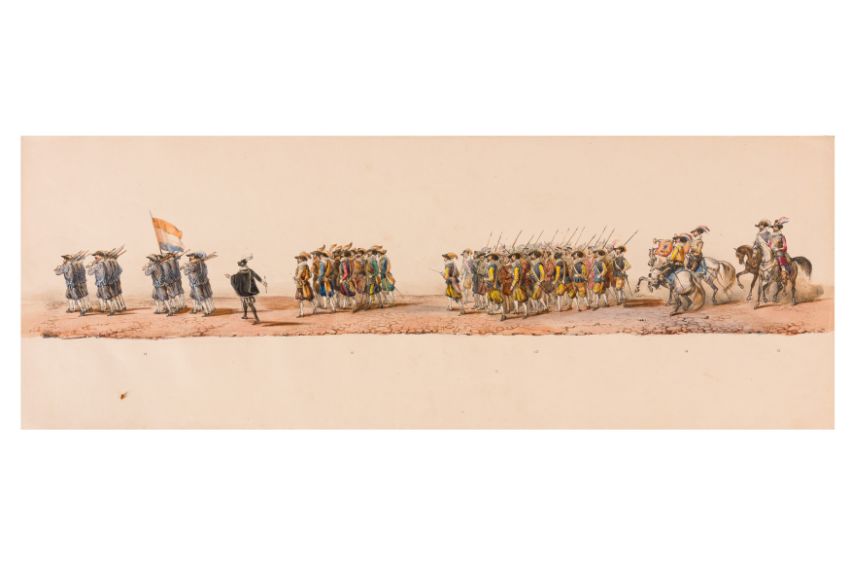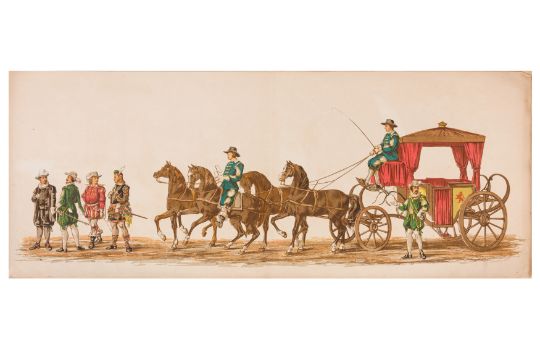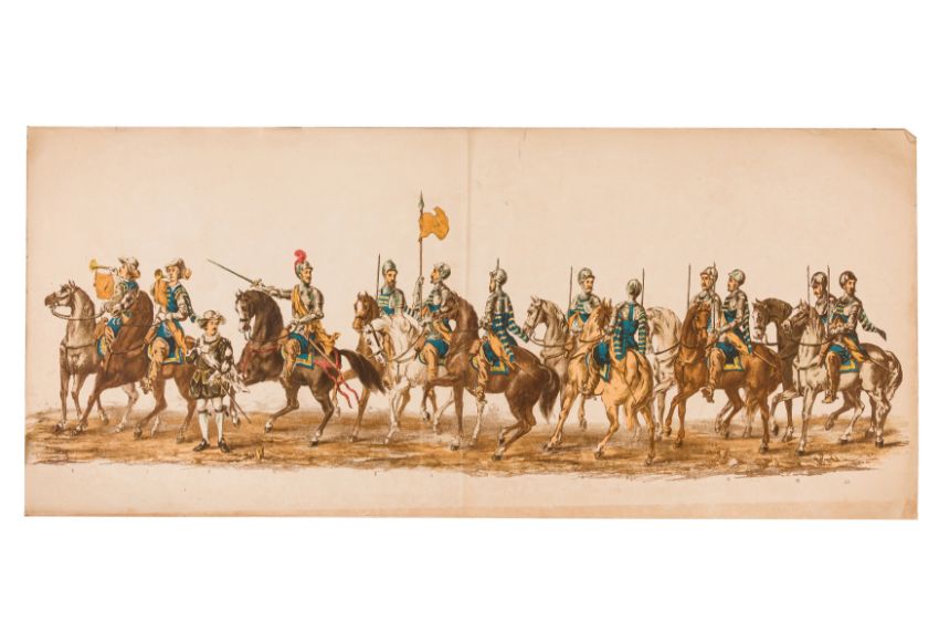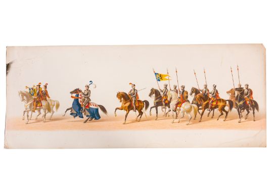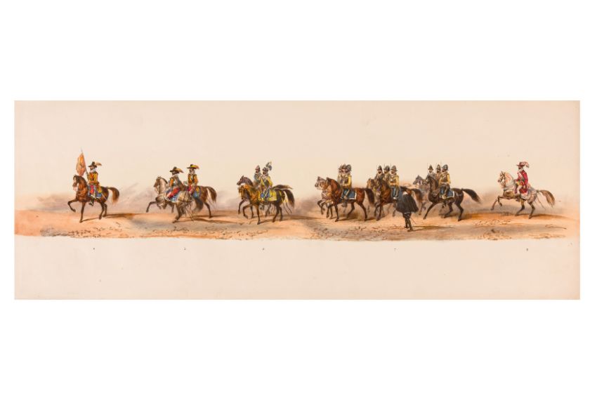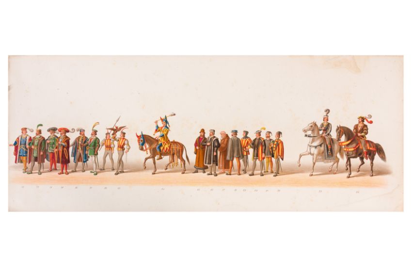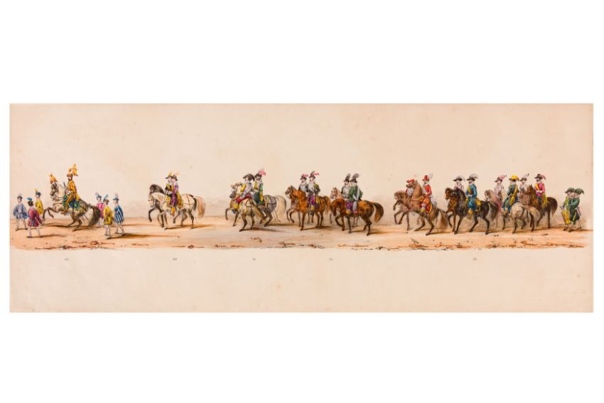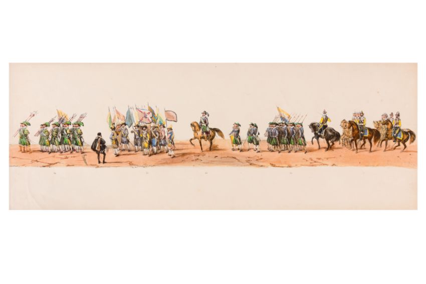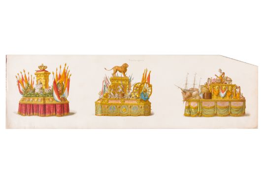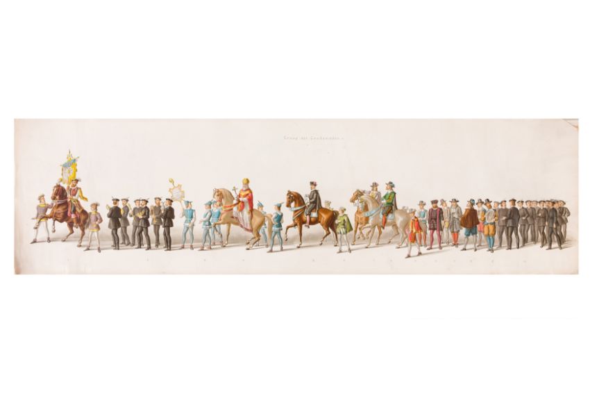 HISTORICAL PROCESSION FOR THE 2ND CENTENARY OF THE UTRECHT UNIVERSITY, 1836. Hand-coloured lithographic panorama by Victor Adam and Joseph-Rose Lemercier, from an untitled portfolio, published by Caramellie & Co. and A Collings & van den Hout., 1836. Comprising ten loose sheets, each measuring 228 x 625mm, housed in a portfolio measuring 245 x 645mm, title and publication details printed on the left of the first sheet; the artist's name printed on the right of the tenth sheet, each image numbered 1-43.This Dutch processional panorama commemorates the bi-centenary of the Utrecht High School (title print), 16 June 1836, including a re-enactment of the parade of the Dutch armies to Ostend, on 3 July 1600, the day after the victory at Nieuwpoort.
