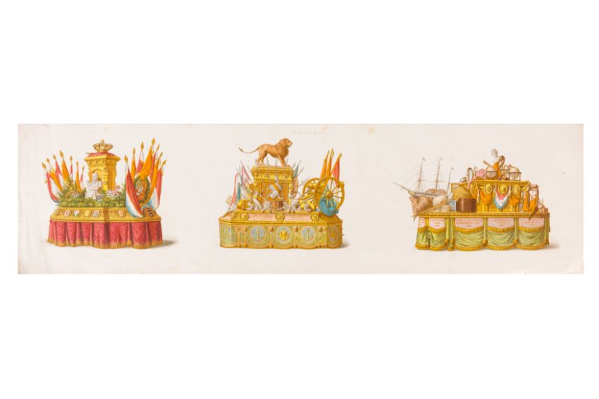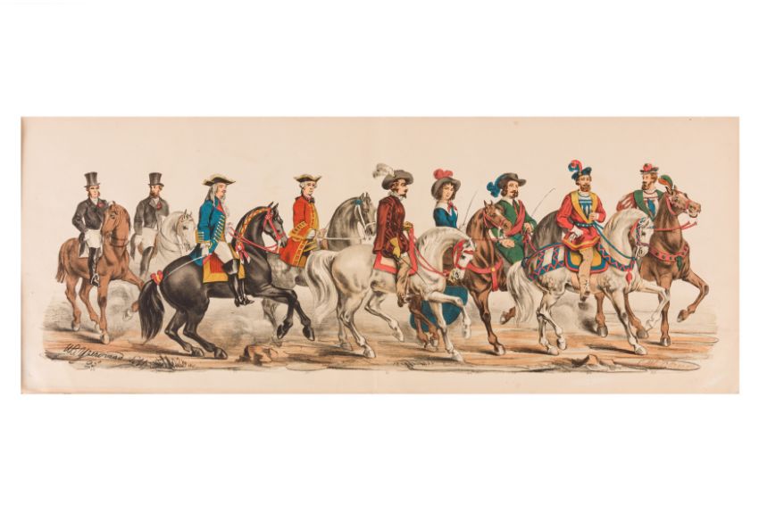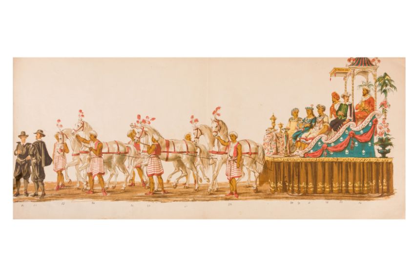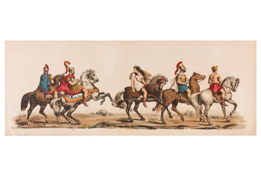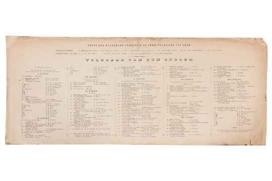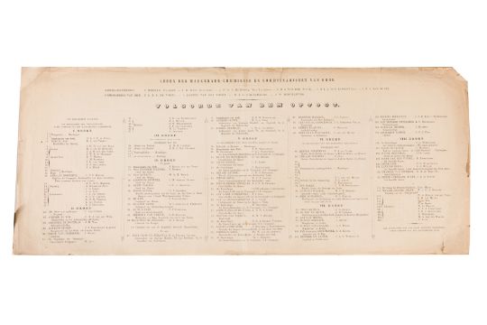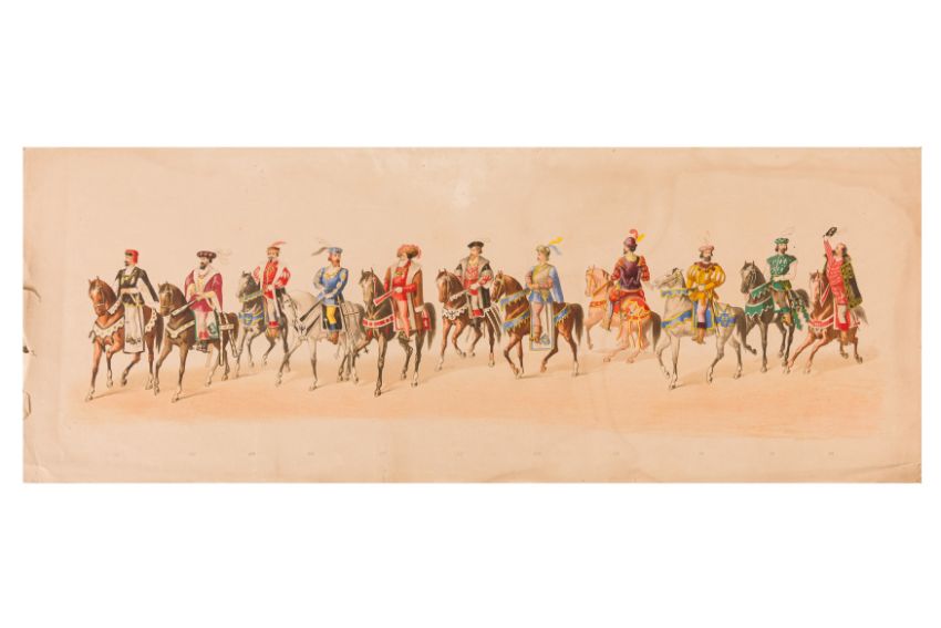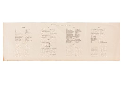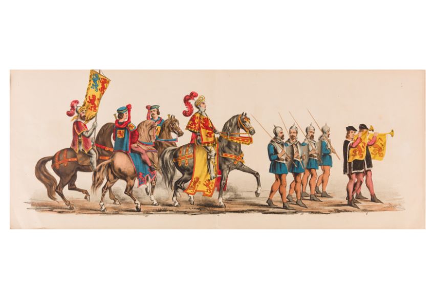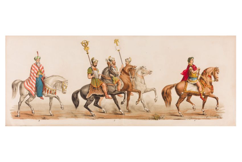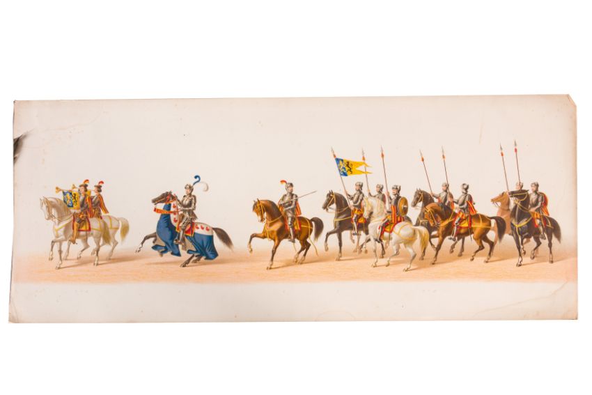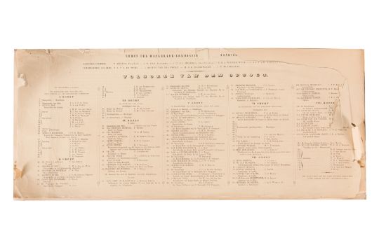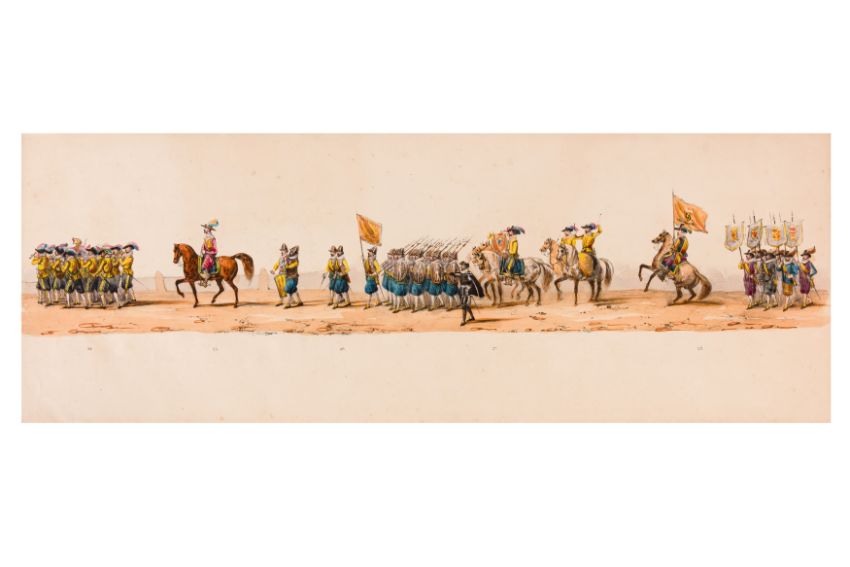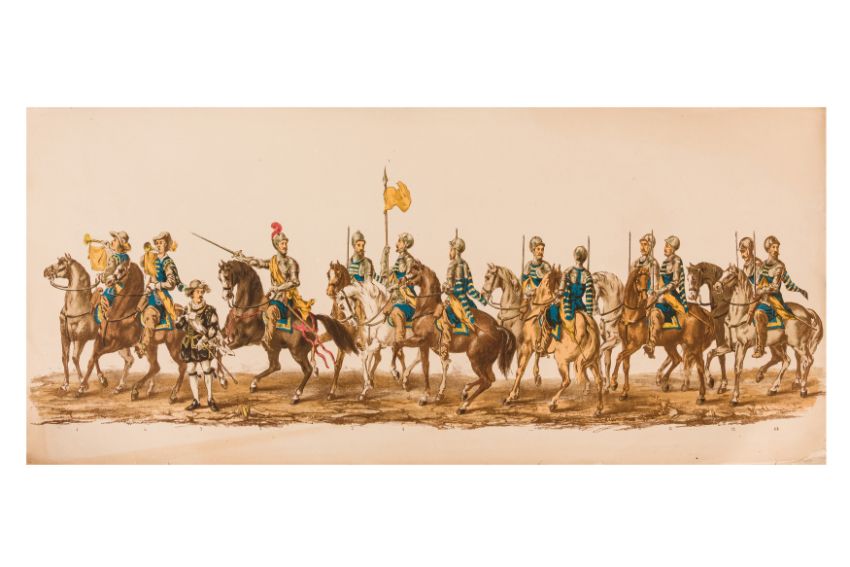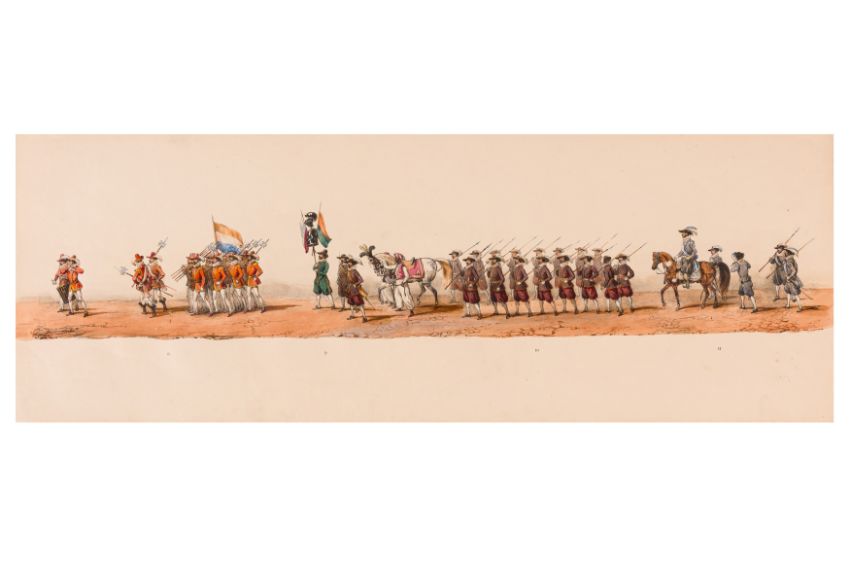 HISTORICAL PROCESSION FOR THE 2ND CENTENARY OF THE UTRECHT UNIVERSITY, 1836. Hand-coloured lithographic panorama by Victor Adam and Joseph-Rose Lemercier, from an untitled portfolio, published by Caramellie & Co. and A Collings & van den Hout., 1836. Comprising ten loose sheets, each measuring 228 x 625mm, housed in a portfolio measuring 245 x 645mm, title and publication details printed on the left of the first sheet; the artist's name printed on the right of the tenth sheet, each image numbered 1-43.This Dutch processional panorama commemorates the bi-centenary of the Utrecht High School (title print), 16 June 1836, including a re-enactment of the parade of the Dutch armies to Ostend, on 3 July 1600, the day after the victory at Nieuwpoort.