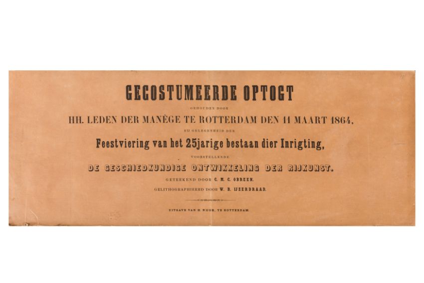 Publication consisting of six loose plates, key sheet, and title sheet, each measuring 280 x 712mm, all housed in paper covers, the whole object housed in a portfolio measuring 285 x 725 mm. Chromolithograph Dutch processional panorama, title lettered in gilt on the front of the portfolio, ‘Gecostumeerde Optogt te Rotterdam 11 Maart 1884’. Ref. numbers (1-33) appear in the bottom margins of the plates. The characters are identified on the key sheet (‘Programma’), published by H. Nijgh. [Gecostumeerde Optogt Gehouden door HH. Leden der Manege te Rotterdam den 11 Maart 1864, bij gelegenheid der Feestviering van het 25jarige bestaan dier Inrigting, voorstellende de Geschiedkundige Ontwikkeling der Rijkunst.Geteekend door C. M. C. Obreen. Gelithographieed door W. B. Ijzerdraad. Utigave van H. Nijgh, te Rotterdam].